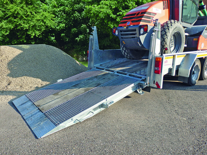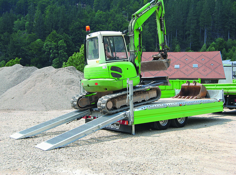 Mit Tandem-Tiefladern von Müller Mitteltal sollen Unternehmen für den Transport moderner und hochwertiger Baumaschinen im Garten- und Landschaftsbau gut gerüstet sein. Niedrige Ladekanten, praxisorientierte Auffahrrampentechnik und Ladungssicherung unterstützen das Bedienpersonal im Umgang mit dem Fahrzeug. Schon in der kleinen 5,5-t-Gesamtgewichtsklasse, der ETS-Baureihe, drückt sich die Tiefladertechnik zum Beispiel durch professionelle Detaillösungen wie stabile und leicht bedienbare, federunterstützte Rampen oder durch die stabile Bodengruppe aus.