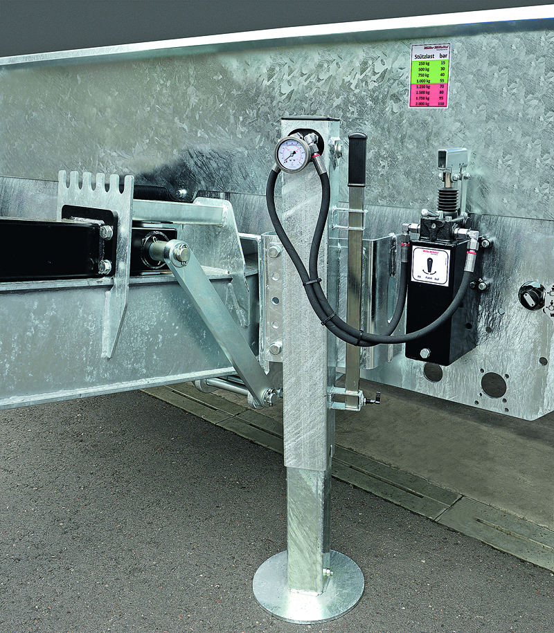 Besonders bei Tandem-Fahrzeugen ist die richtige Stützlast ein wichtiger Sicherheitsaspekt. Zu wenig Stützlast beeinflusst das Fahrverhalten ebenso negativ wie eine zu hohe Stützlast. Safety Control ist das von Müller Mitteltal entwickelte Stützlast-Messsystem, das dem Fahrer zu jedem Zeitpunkt die aktuelle Stützlast anzeigt, die auf der Kupplung des Zugfahrzeugs lastet. Damit hat er die Gewissheit, die gesetzlichen Vorschriften einzuhalten und sein Fahrzeuggespann in bestmöglicher Lastabstimmung zu betreiben (das bauMAGAZIN berichtete bereits in Heft 7/17, Seite 99). §