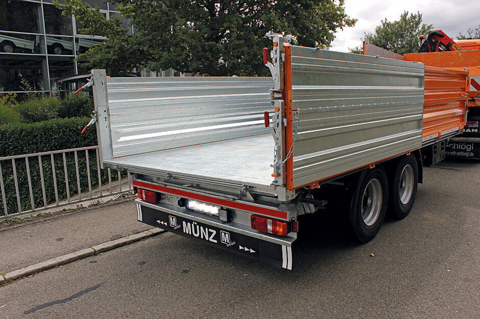 Für die einfache Verladung ohne Rampen bietet Münz Fahrzeugbau noch seine Tandem-Dreiseiten-Absenkkipper-Reihe (TDAK) als Schüttguttransport und Maschinentransport in einem Fahrzeug mit der Absenkmöglichkeit der Pritsche nach hinten auf die Fahrbahn an. §