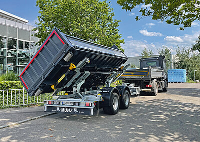 Münz bietet neben den Abrollkippanhängern auch weitere Multitalente wie den Tandem-Dreiseitenabsenk-Kipper (TDAK) Schüttguttransport- und Maschinentransport in einem Fahrzeug, Tandem-Dreiseitenabsenk-Kipper-Light (TDK-L) speziell für Anforderungen im Gelände und Tandem Absenkkipper (TAA) Fahrzeuge für Maschinentransporte an.
