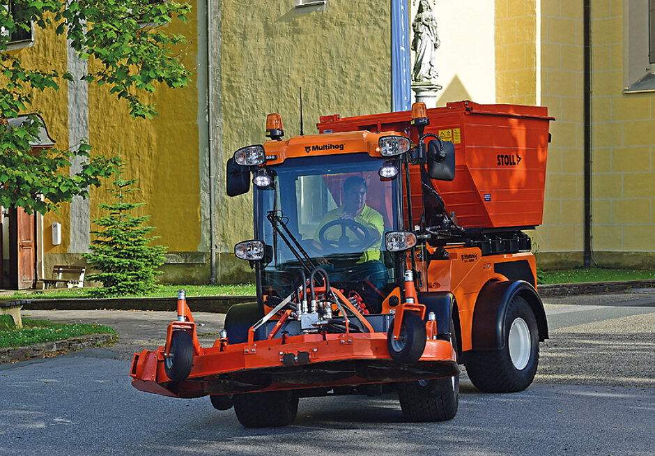 Für den Winterdienst wird der Multihog vorne mit einem V-Schneepflug und am Heck mit einem Streugerät von Kahlbacher ausgestattet. Dank hydrostatischer Knicklenkung kommt er überall dort hin, wo größere Geräte es nicht hin schaffen. Wenn die Schlechtwetterzeit vorbei ist sorgt ein Frontsichelmäher sowie ein Aufbausauger der Marke Stoll für effizientes Mähen und Saugen in einem Arbeitsgang.