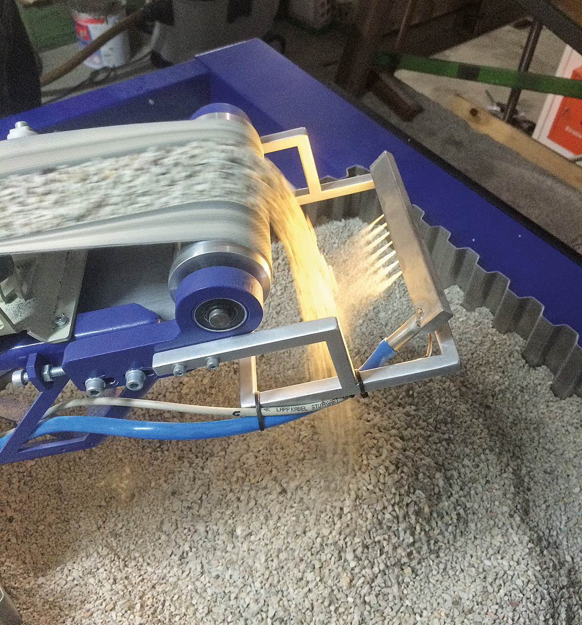 Weitertransportiert wird aufgegebener Kies auf einem Förderband mit beweglicher Bandübergabe sowie einem stationären Bandabwurf. Beide Positionen werden ebenfalls benebelt. Das Förderband verfügt über eine Bandwaage, über die die Nebelintensität je nach Materialaufkommen gesteuert wird. Über ein zweites Förderband wird das Schüttgut wieder dem Lagerplatz zugeführt.
