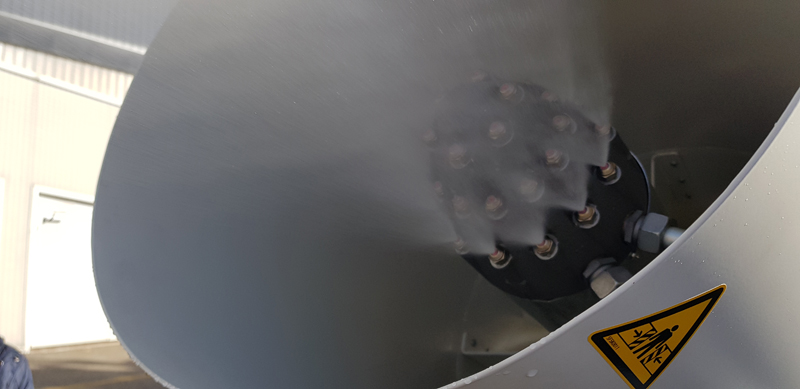Der patentierte Düsenkopf ist axial in die Turbine eingebaut und erreicht eine deutlich höhere Wurfweite als vergleichbare Düsenkonfigurationen. Der zielgerichtete Nebelstrahl ist weniger windanfällig.