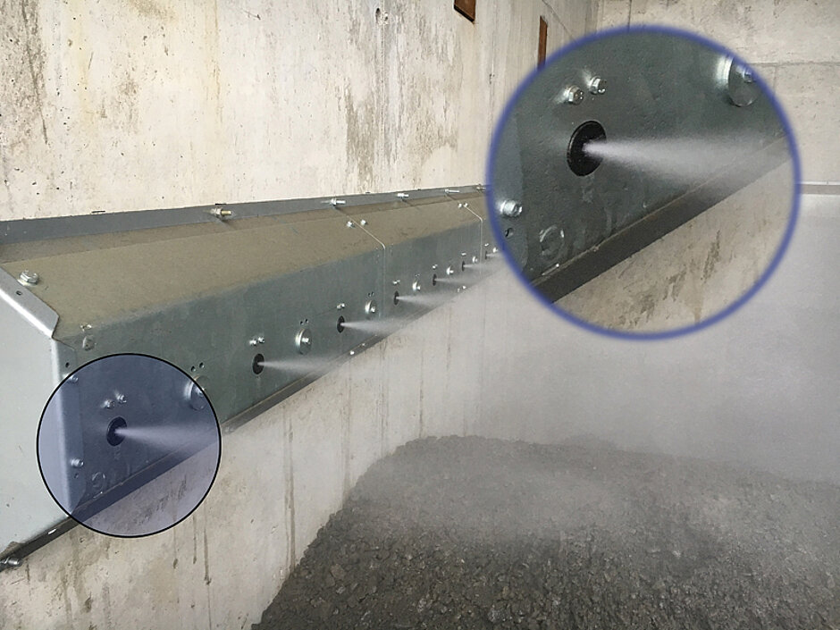 Sensoren einer Lichtschranke oder des Ultraschalls aktivieren bei Bedarf die Benebelung, um ein gezieltes Ansteuern des Sprühgebiets im Falle des Staubbefalls zu gewährleisten. Diese Lösung trägt zur Ressourcenschonung bei; im Vergleich zu herkömmlichen Maßnahmen wird laut Anbieter bis zu 50 % weniger Wasser als üblich verbraucht.