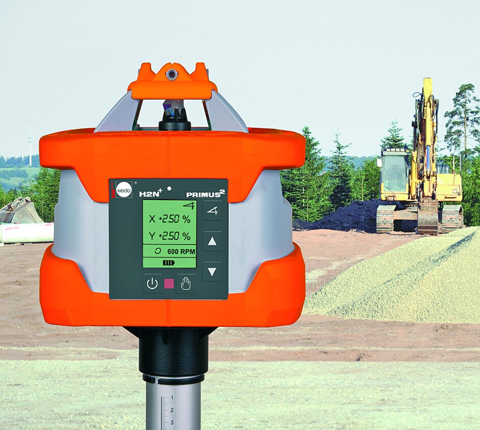 Bei starken Erschütterungen stoppt die integrierte Höhenkontrolle den Laser, um Messfehler zu vermeiden. Dadurch liegt die Nivelliergenauigkeit des Primus² H2N bei ± 0,5 mm pro 10 m Entfernung und ± 0,015 % in beiden Neigungsachsen. Die Reichweite des Lasers beträgt bis zu 700 m, um ein weitgehend unterbrechungsfreies Arbeiten sicher zu stellen. In Kombination mit dem AcceptorM reduziert der Rotationslaser somit den Zeitaufwand bei Aushubarbeiten und gewährleistet einen sicheren Ablauf, da sich keine Person zum Einweisen im Schwenkbereich befindet. §