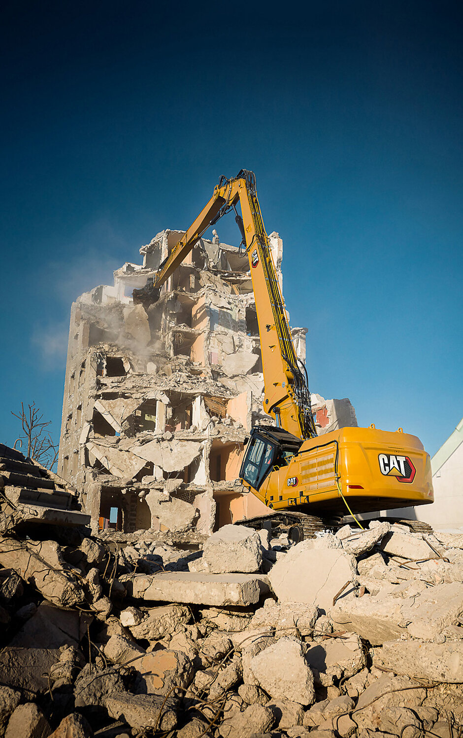 Garching (KF). Der Abbruchbagger Cat 352 UHD (Ultra High Demolition) mit langer Abbruchausrüstung wurde speziell für effiziente Abbrüche hoher Bauten unter Verwendung vielfältiger Cat Anbaugeräte konstruiert. Dazu gehören diverse Pulverisierer, Scheren, Greifer und Hydraulikhämmer. Die Maschine kann mit einer zusätzlichen Erdbauausrüstung mit variabel montierbarem Ausleger flexibel an den Arbeitsfortschritt angepasst werden. Der Wechsel erfolgt in der Regel mit zwei Personen ohne Spezialwerkzeug innerhalb von 15 Minuten. Für sicheren Stand und vereinfachten Transport verfügt der Cat 352 UHD über ein ausfahrbares Kettenlaufwerk mit hydraulischer Spurverstellung. Zur weiteren Ausstattung gehört das aktive Standsicherheits-Überwachungssystem von Cat, das den Fahrer fortlaufend über die Anbaugeräteposition im sicheren Arbeitsbereich informiert und bei Annäherung an die Kippgrenze warnt.