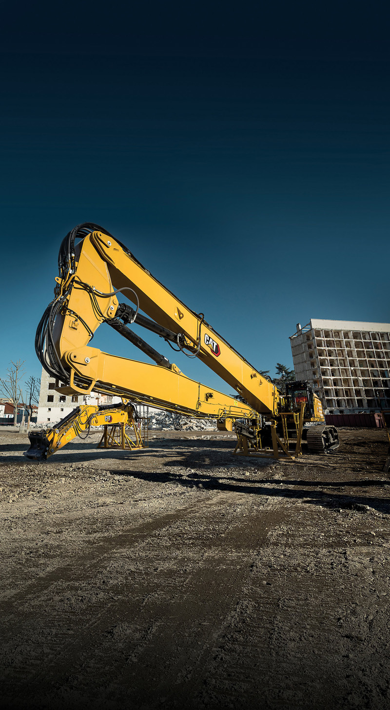 Voll ausgefahren erreicht der Cat 352 UHD eine Arbeitshöhe von 28 Meter gemessen am Anbaugeräte-Befestigungsbolzen und eine waagrechte Reichweite von 15,8 Meter bestückt mit einem 3,7 Tonnen schweren Anbaugerät. Diese üppige Auslegung ermöglicht den Rückbau von acht- bis neunstöckigen Bauten – dank der elektrohydraulischen Vorsteuerung der Cat Bagger der neuen Generation mit hoher Geschwindigkeit und Präzision. Für eine optimale Standsicherheit im Betrieb sorgt das ausgefahrene Laufwerk mit einer Spurweite von 4 Metern, für den Transport beträgt die Spurweite 3 Meter bei 600 Millimeter großen Bodenplatten. Mit Erdbauausrüstung und einem 3,08 Kubikmeter fassenden Löffel verfügt der Cat 352 UHD über eine Grabtiefe von 6,7 Meter und eine maximale Reichweite auf Standebene von 11,9 Meter. Der Erdbauausleger kann außerdem in einer zweiten Position montiert werden, so dass er den Einsatz schwerer Anbaugeräte auf niedrigeren Arbeitshöhen optimal unterstützt.
