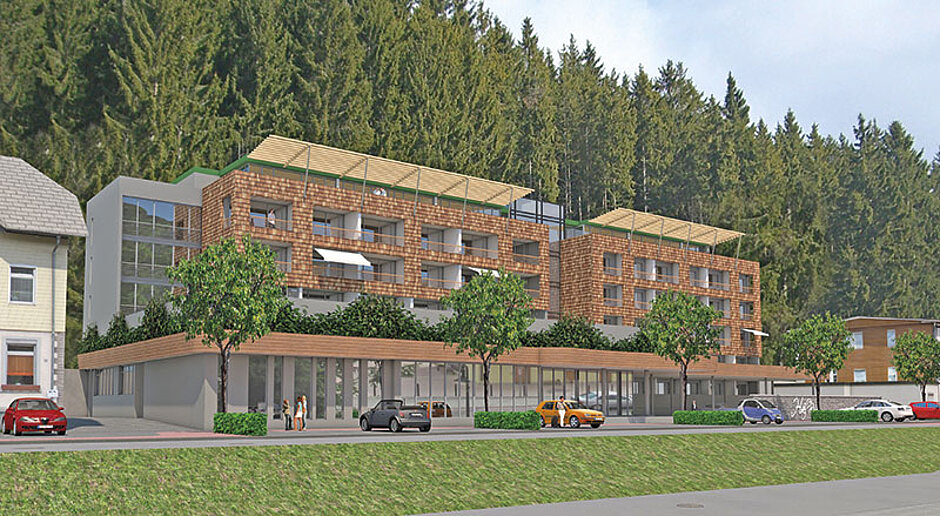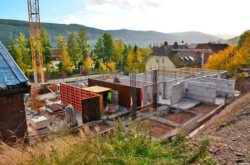 Bei der Tragwerksplanung musste die Erdbebenzone II berücksichtigt werden, was sich in der Bewehrung sowie in den Bauteilabmessungen widerspiegelt. Allein für die Bauwerksgründung weist die Bauakte 35 t Bewehrungsstahl für die Streifen- und Einzelfundamente aus. Die zu berücksichtigende Erdbebenzone sowie die Hangsituation erforderte die Ausführung zu fast 100 % aus Stahlbeton. Deshalb wurde der gesamte Rohbau, bestehend aus Kellergeschoss, Erdgeschoss, vier Obergeschossen und dem Dachgeschoss, weitestgehend aus Stahlbeton der Güte C25/30 erstellt. Die tragenden Betonwände sind zwischen 24 cm bis 40 cm dick. In Form gebracht wurden rund 1 200 m³ Beton. Die aufzunehmenden Zugkräfte werden dabei von fast 260 t Betonstahl aufgenommen.Für die Arbeitsvorbereitung und Schalungsplanung nutzte das ausführende Rohbauunternehmen, die mittelständische und inhabergeführte Bauunternehmung Anton Himmelsbach, die automatisierte Schalungsplanung Paschal-Plan light. Die Software wurde zur aktiven Unterstützung der Bauunternehmer zur Baustellenplanung, der Organisation wie auch der Schalungsplanung entwickelt. Mittlerweile ist die Version 10.0 im Einsatz, die auch von der Bauunternehmung Himmelsbach genutzt wurde. Die aktuelle Version besteht aus zwei Modulen. Dem Modul »Design« zum vollautomatischen Erstellen der kompletten Schalungspläne und dem Modul »Warehouse« zum Verwalten der Materialien auf dem Bauhof und den Baustellen.