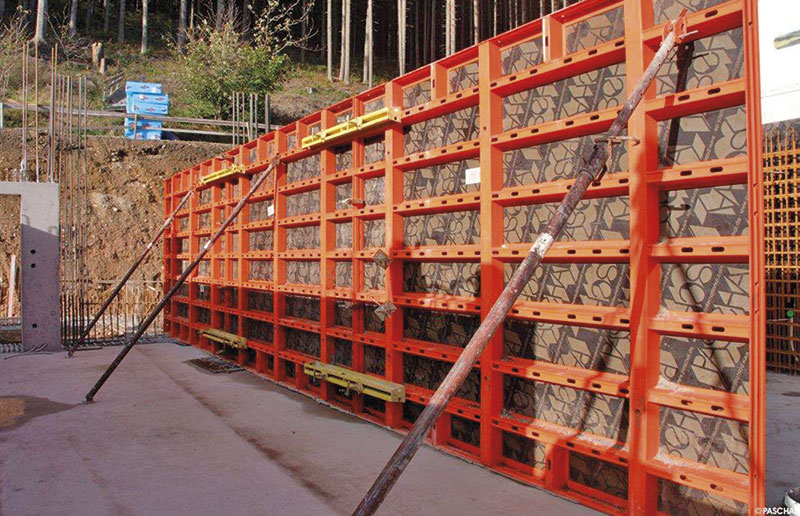 Im Einzelnen überzeugten ihn und seine Mitarbeiter die reduzierten Spannstellen (0,62 Spannstellen/m²), das schnelle Verbinden der Elemente mittels Keilspanner, die variable Verwendung liegend und stehend sowie der zulässige Frischbetondruck von 70 kN/m² nach DIN 18 218.