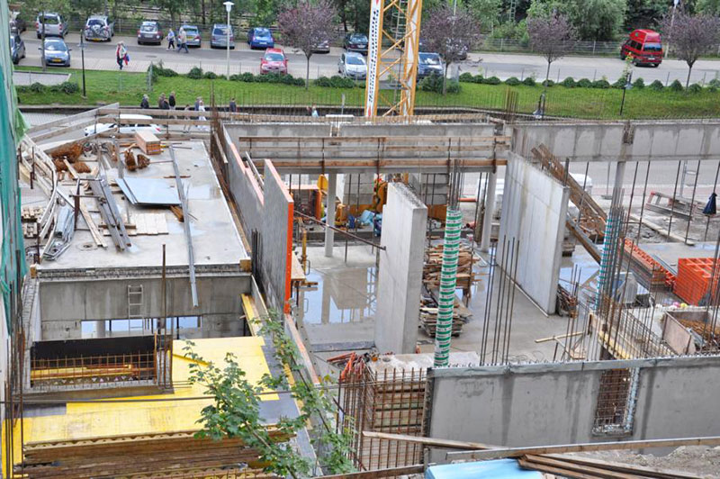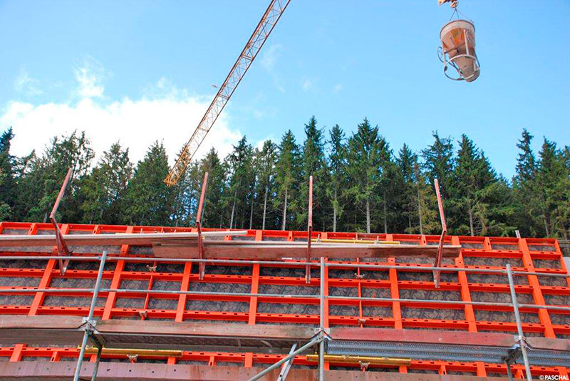 Die Bauunternehmung Anton Himmelsbach setzt seit 17 Jahren auf die Universalschalung Raster/GE von Paschal, die auch hier zum Schalen der Gründung, der Stützen und Unterzüge eingesetzt wurde. Auch das Schalungssystem Logo3 gehört zum langjährigen Inventar. Aufgrund der Geschosshöhen testete das Bauunternehmen bei dem Projekt das Schalungssystem Logo3 in seinen Abmessungen 2,7 m x 3,4 m. Dazu mietete der Bauunternehmer zunächst 300 m² Logo3 mit diesen Abmaßen und kombinierte sie mit seiner Logo3-Bestandschalung.Zum Schalen der Kellergeschosswände wurde die Logo3 stehend mit einer Höhe von 3,4 m verwendet. Im Erdgeschoss wurde ein Element hochkant mit einem waagerecht liegenden Element kombiniert, um in einem Schritt die gesamte Geschosshöhe zu erreichen. Für die Erstellung der nachfolgenden vier Obergeschosse wurde die Logo3 mit ihrer Breite von 2,7 m liegend genutzt.