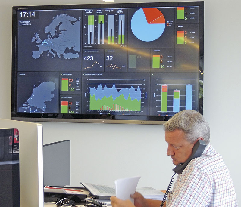 Mittels Realtime Statusboard wird die Fülle transportrelevanter Kennzahlen grafisch und in Echtzeit dargestellt. Die Funktion weist umgehend auf Aspekte hin, die sofortige Aufmerksamkeit verlangen. »Falls Belade-, Entlade- oder Wartezeiten zu lange dauern, wird der Nutzer direkt informiert. Dadurch vermeiden Kunden unnötige Kosten«, betont Holtrup. Das Realtime Statusboard ist am PC und mobil per Tablet nutzbar.