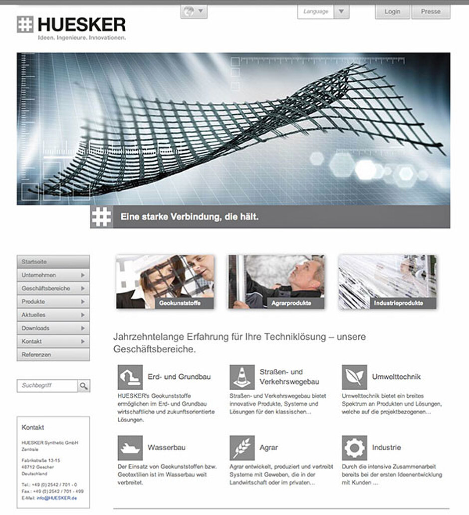Ein Schwerpunkt wurde auf die einfache Menüführung sowie den Wechsel zwischen Produktseiten und Geschäftsbereichsseiten gelegt. Durch intelligente Verlinkungen und ein neues Kontaktkonzept soll dem Nutzer immer die passende Information zur rechten Zeit an die Hand gegeben werden. Im Downloadbereich besteht die Möglichkeit sich unter anderem Berichte oder Prospekte herunter zu laden. Damit Kunden, Lieferanten und Partner immer auf dem aktuellen Stand der Information bezüglich der HUESKER Gruppe sind, wurde auf der Startseite ein Newsticker installiert, der die neuesten Nachrichten der Gruppe anzeigt.