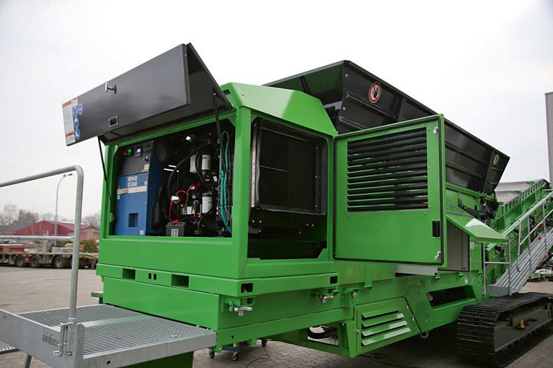 Das gesamte Gehäuse hat ein Gewicht von 2,2 t und lässt sich mit wenigen Handgriffen sowie mithilfe eines Gabelstaplers oder eines Krans von der Maschine heben. Der Antrieb kann somit weit entfernt von der Maschine selbst und geschützt von Staub und Dreck aufgestellt werden. Das schützt nicht nur den Luftfilter vor starken Verunreinigungen, sondern zudem auch den Dieselmotor vor einer möglichen Überhitzung. Nutzer, denen Netzstrom zur Verfügung steht, können die Maschine damit ebenfalls betreiben. Der entsprechende 125-A-Stecker befindet sich geschützt unter dem Aufgabebunker. Ein 55 kW starker Elektromotor übernimmt den Hauptantrieb der Hydraulikpumpen. Die verbauten Ventile stammen weiter aus der PVG-32-Serie von Sauer Danfoss.