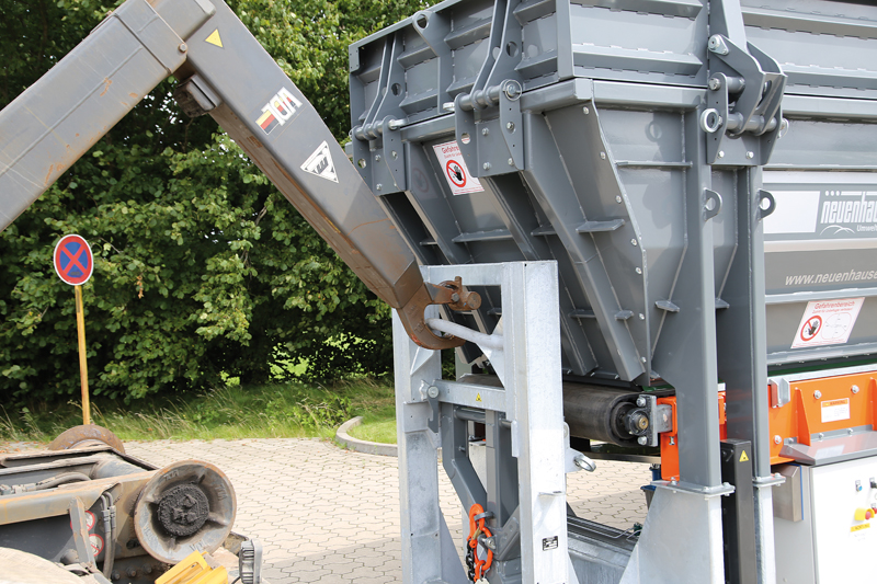 Kabellos bedienbar ermöglicht der Dosierbunker die Aufbewahrung, Förderung und Vergleichmäßigung von Bodenaushub, Gartenabfällen, Kohle, Grünschnitt, Altholz sowie Müll aus Haus und Industrie vor Ort. Um für alle Herausforderungen gewappnet zu sein, die sich aus einer vielseitigen Aufgabenstellung ergeben, verfügt der mobile Dosierbunker über einen Hakenliftrahmen, einen innenverzahnten Bunkergurt, identisch wie bei den Neuenhauser-Siebmaschinen, und eine Stabwalze, die auch bei schwersten Einsätzen ein Durchrutschen des Austragsbandes verhindern soll.