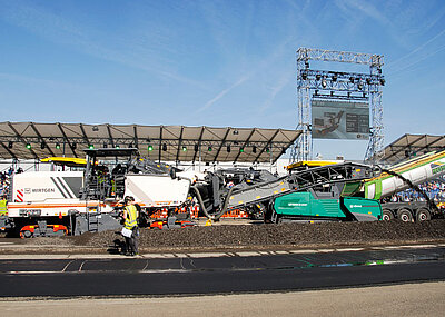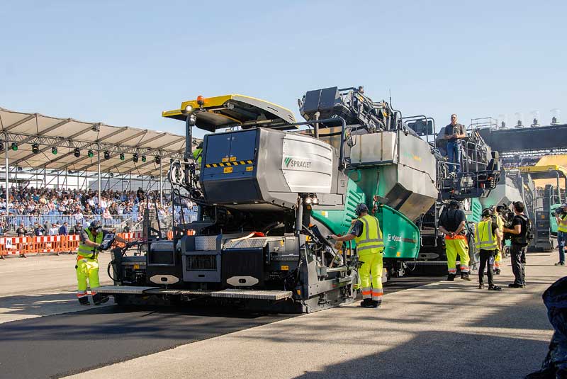 Bei zwei Live-Demonstrationen frästen, beschickten, asphaltierten und verdichteten insgesamt 25 Maschinen auf einer Fläche von rund 3 000 m². »Mit den Live-Demos präsentieren wir nicht nur modernste Technologien und Lösungen für den Straßenbau. Unsere Kunden erleben auch, wie die Maschinen der Wirtgen Group in der Praxis zusammenarbeiten und welche Synergien sich dadurch für den gesamten Straßenbauprozess ergeben», sagte Roland Schug, Marketingleiter der Joseph Vögele AG und gesamtverantwortlich für die diesjährigen »Road Technology Days«. »Die Live-Demos sind deshalb immer das Herzstück unserer Technologietage.«