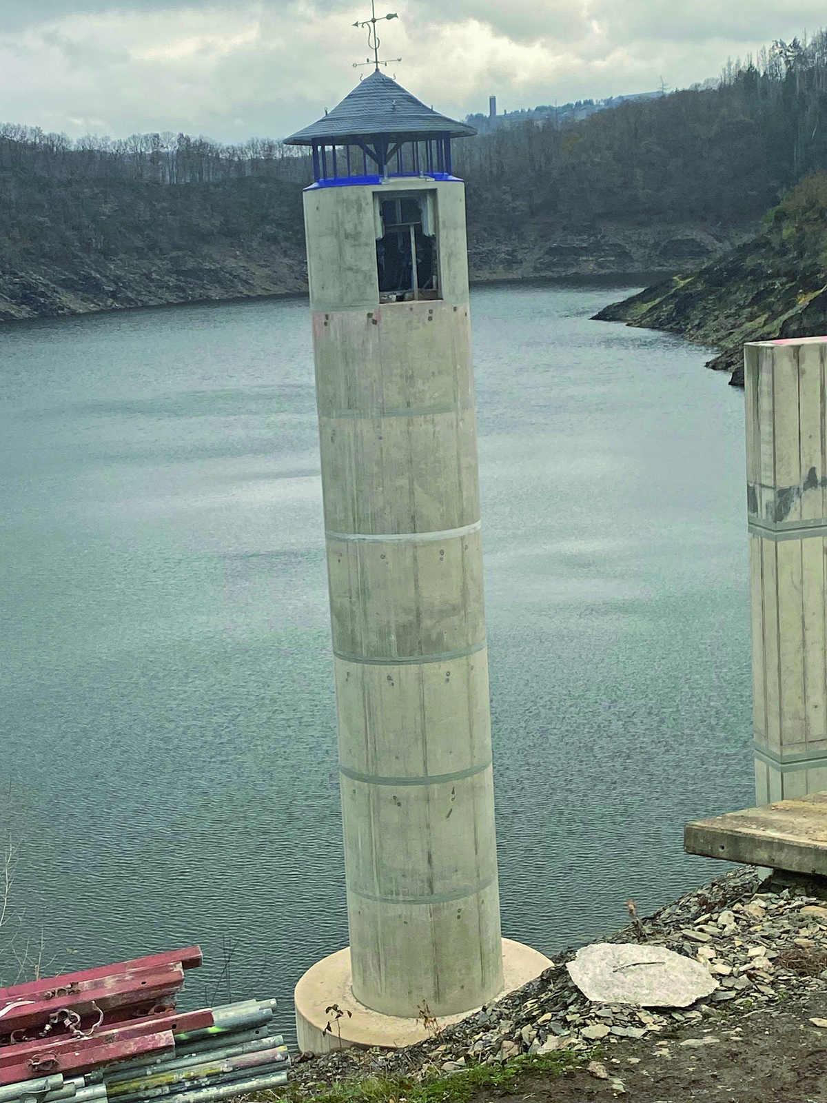 Auch wenn man mit der Schalung von Paschal sieben Mal nach oben wanderte, handelte es sich streng genommen nicht um eine Kletterschalung. Aufgrund des beengten Raums wurde die Schalung zwischen den Takten am Boden abgesetzt, während die Bühnen separat nach oben versetzt wurden. »Im Prinzip sind wir schon geklettert. Das Absetzen der Schalung am Boden ließ sich nicht vermeiden. Aus Platzgründen konnten wir sie nicht nach hinten verfahren, um die Armiereisen zu setzen«, betont Martin Ketterer. »Die Schalung wurde zwischen den Schalungs-Takten gereinigt und biologisch abbaubares Trennmittel aufgetragen – das ließ sich besser im Baustelleneinrichtungsbereich erledigen«, fügt Theo Mies hinzu. Am 20. November 2023 war es soweit. Der Betonmantel für den Schieberturm war fertig geschalt; dank der Rundschalung TTR ist auch der dritte Turm der Urfttalsperre heute stabil und in Zukunft gegen Erdbeben gewappnet. Die Talsperre in der Nordeifel ist nun mindestens für weitere hundert Jahre uneingeschränkt in der Lage, die Menschen in der Region vor Hochwasser und Trockenperioden zu schützen.d