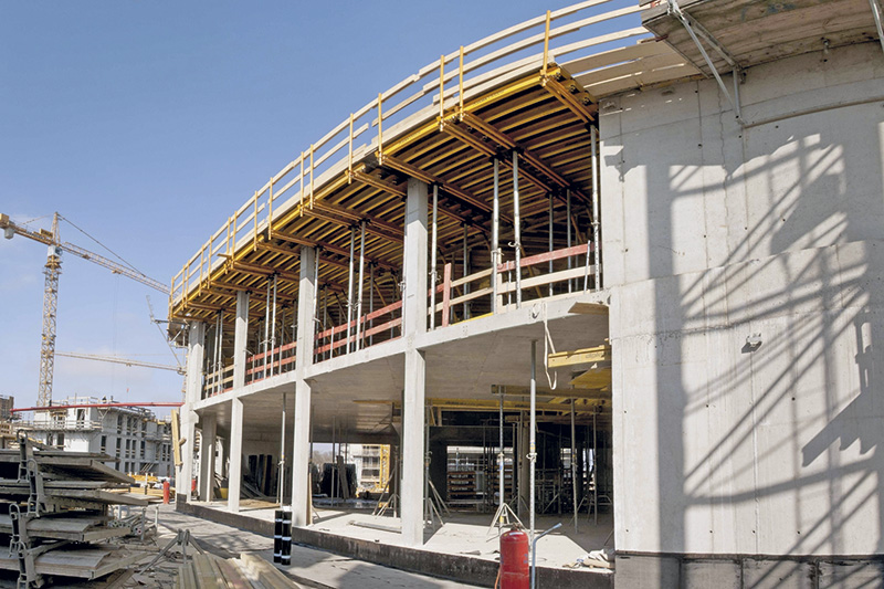 Neben der Orma-Rahmenschalung – sie wird für die Erstellung von Fundamenten, Wänden und Treppenhauskernen verwendet – kommen die ULMA-Deckenschalung Enkoflex, Stützenschalungen, Klapparbeitsbühnen und Schachtbühnen für die Aufzugsschächte zum Einsatz. Zudem das Traggerüst T-60 für hohe Decken und zur Balkonunterstellung sowie die Rundschalung Midi plus für die Herstellung der Rampenwände und Abstützböcke für einhäuptige Wände. »Damit ist praktisch unser komplettes Schalungssortiment auf der Baustelle im Einsatz«, erläutert Andreas Abdul, er ist Niederlassungsleiter Süd bei ULMA Betonschalungen und Gerüste.Auf der Baustelle wird mit dem Deckentisch MK erstmals eine neue Generation Deckenschaltische eingesetzt, die besonders in Bezug auf Tragfähigkeit und Flexibilität deutliche Vorteile gegenüber herkömmlichen Systemen versprechen will. »Das Raster der MK-Stahlprofile ermöglicht die flexible Positionierung von Tischköpfen und Zubehörteilen für wechselnde statische und geometrische Anforderungen«, beschreibt ULMA-Projektleiterin Karla Bormann einen Vorteil des Systems, dessen niedrige Bauhöhe zusätzlich Transportkosten spart.