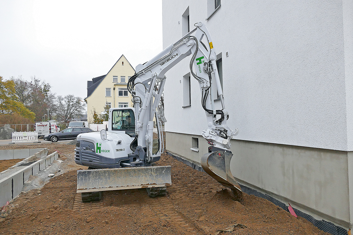 Das Unternehmen Heger Garten- und Landschaftsbau aus Mühlheim am Main ist seit Gründung im Jahr 2016 auf den Bau von Außenanlagen großer Wohneinheiten spezialisiert. Auch dafür hat man sich den Takeuchi TB 290-2 mit Tiltrotator und etlichen Anbaugeräten beim regionalen Händler Horst Martin in Langenselbold angeschafft. Zurzeit ist der Bagger in Hanau beim »Pioneer-Park« im Einsatz. Der Umbau des bis 2008 von den US-Streitkräften genutzten 50 ha großen Kasernengeländes in Wohnbebauung mit 1 500 Einheiten für 5 000 Menschen hat begonnen. Heger errichtet die Außenanlagen wie Wege, Grünflächen und Spielplätze. Dafür muss der TB 290-2 eine große Palette unterschiedlicher Leistungen bewältigen, wie das Heben und Bewegen von schweren, mit Steinen beladenen Paletten, ebenso wie den Transport und das Positionieren großer und schwerer Betonfertigteile. Aber auch das feinfühlige Arbeiten unmittelbar an Hauswänden oder Mauern und das präzise Auskoffern von Schächten steht auf dem Programm. Der TB 290-2 verbindet dabei Beweglichkeit, Kraft und Präzision miteinander. t