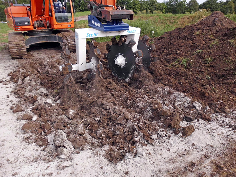 Jürgen Schnell vom gleichnamigen Unternehmen aus Ockenheim am Rhein fiel bei einem Besuch im Hause Stehr der Bagger-Mischer schon auf, als dieser sich noch in der Testphase befand. Er zeigte sich gleich von der Technik begeistert. Als die Testphase abgeschlossen war, wurde ein Gerät, das mittlerweile auch einen Namen hatte – Stehr-EXmix, auf eine Schnell-Baustelle in Riedberg, einem neuen Stadtteil von Frankfurt, gebracht. Hier wird der Bodenaushub mit Flugasche verbessert und eingebaut. Nach kurzer Zeit stellte man fest, dass mit dem neuen Stehr-Gerät die fünffache Leistung einer Siebschaufel erreicht werden konnte. Somit kann der Bauablauf kostengünstiger und schneller durchgeführt werden. Da das Material mehrmals hin und her, von unten nach oben bewegt wird, erfolgte eine optimale Mischung.Das neue Verfahren beeindruckte auf der Baustelle auch Baggerfahrer und Vorarbeiter Willi Hammer von der Firma Wengerter aus Klingenberg. Der Stehr-EX-mix hatte sich hier gleich dem Untergrund eines 700 m² großen Parkplatzes zu widmen. Kalk zur Bodenverbesserung konnte in dem stark bebauten Gebiet nicht eingesetzt werden. Ein Bodengutachter legte fest, den Boden auf 40 cm Tiefe mit 20 % Güte geprüftem Recyclingmaterial zu verbessern. In rund einer Stunde konnte die ganze Fläche aus stark bindigem, nicht verdichtungsfähigem Lößlehm-Boden so durchgemischt und verbessert werden, dass die Verdichtungswerte anschließend die geforderten Werte übertrafen. Der Bagger-Mischer EX-mix wird in Größen für Bagger von 2 bis 4 t, 4 bis 8 t, 8 bis 16 t und über 16 t angeboten.