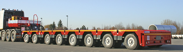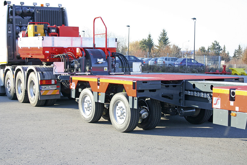 Erstmals vorgestellt wurde das neue Fahrzeugkonzept von SCHEUERLE und NICOLAS auf der diesjährigen Solutrans in Lyon. Wie das »flex« im Namen Superflex andeutet, versprechen die Semi-Tieflader ein hohes Maß an Flexibilität. So ist es möglich, bei Fahrzeugen mit einfacher Teleskopstufe, die beiden vorderen Achslinien in austeleskopiertem Zustand zwischen Schwanenhals und hinterem Fahrwerk in 500 mm Schritten zu verschieben. Bei Fahrzeugen mit doppelter Teleskopstufe können die Achsen sowohl zum Schwanenhals aus auch zum hinteren Fahrwerk geschoben werden. Mit dieser Lösung wird es möglich, das Fahrzeug an die jeweilige Lage des Nutzlastschwerpunkts anzupassen und jede Achslinie optimal auszulasten. Die technische Achslast des Superflex variiert bei Verwendung von verschiedenen Reifentypen. Bei 245/70-R17,5er Bereifung beträgt die technische Achslast 12 t. 14 t Achslast können bei der Verwendung von Reifen der Größe 285/70-R19,5 erreicht werden. Die hydraulische Versorgung des Fahrzeugs erfolgt wahlweise über die Hydraulik der Zugmaschine oder über eine externe PPU (Power Pack Unit). Optional kann jedoch auch eine Elektro-PPU im Schwanenhals integriert werden.