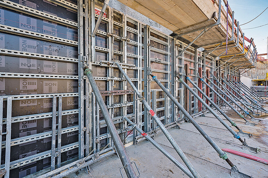 Für die einhäuptige Wandschalung kam der für Wandhöhen von maximal 3,31 m konzipierte NOEtop-Abstützbock zum Einsatz. Bei ihm werden die Schaltafeln mithilfe von Streben sowie Kopf- und Fußlagern in Position gehalten. Zu diesem Zweck müssen sie in der Bodenplatte mit Wellanker und an der Gurtung befestigt werden, die bei allen NOEtop-Großflächenschaltafeln integriert ist.