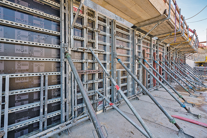 Den Abstützbock verwenden die Köster-Arbeiter für die Untergeschosswände des Bürokomplexes. Hierfür wurde zunächst die Baugrube mithilfe von Bohrpfählen und Spritzbeton gesichert. Anschließend verlegten die Arbeiter eine Drainage und eine Sauberkeitsschicht. Erst dann konnte die einhäuptige Schalung mithilfe des NOEtop-Abstützbocks errichtet werden. t