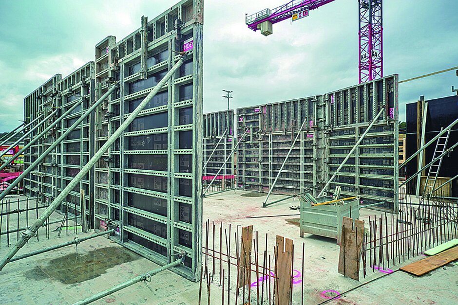 Wie auf fast jeder Baustelle, bei der Schalungen von NOE verwendet werden, kam auch hier die NOEtop zum Einsatz. Die Wandschalung gilt als robust und eignet sich für unterschiedliche Einsatzbereiche. Dank ihrer integrierten Gurtung ist sie auch als Trägerschalung verwendbar. Vor Ort punktete sie durch leichtes Handling – was unter anderem auch darauf zurückzuführen ist, dass zu ihrer Montage lediglich zwei verschiedene Verbindungsmittel erforderlich sind.