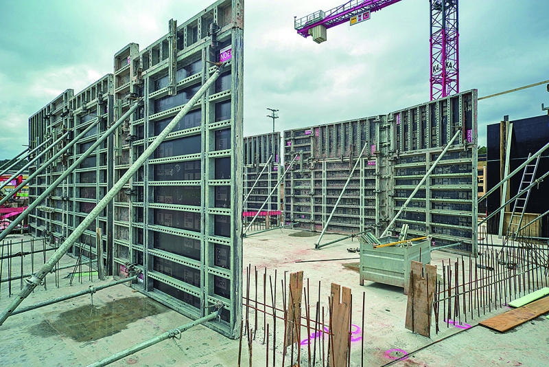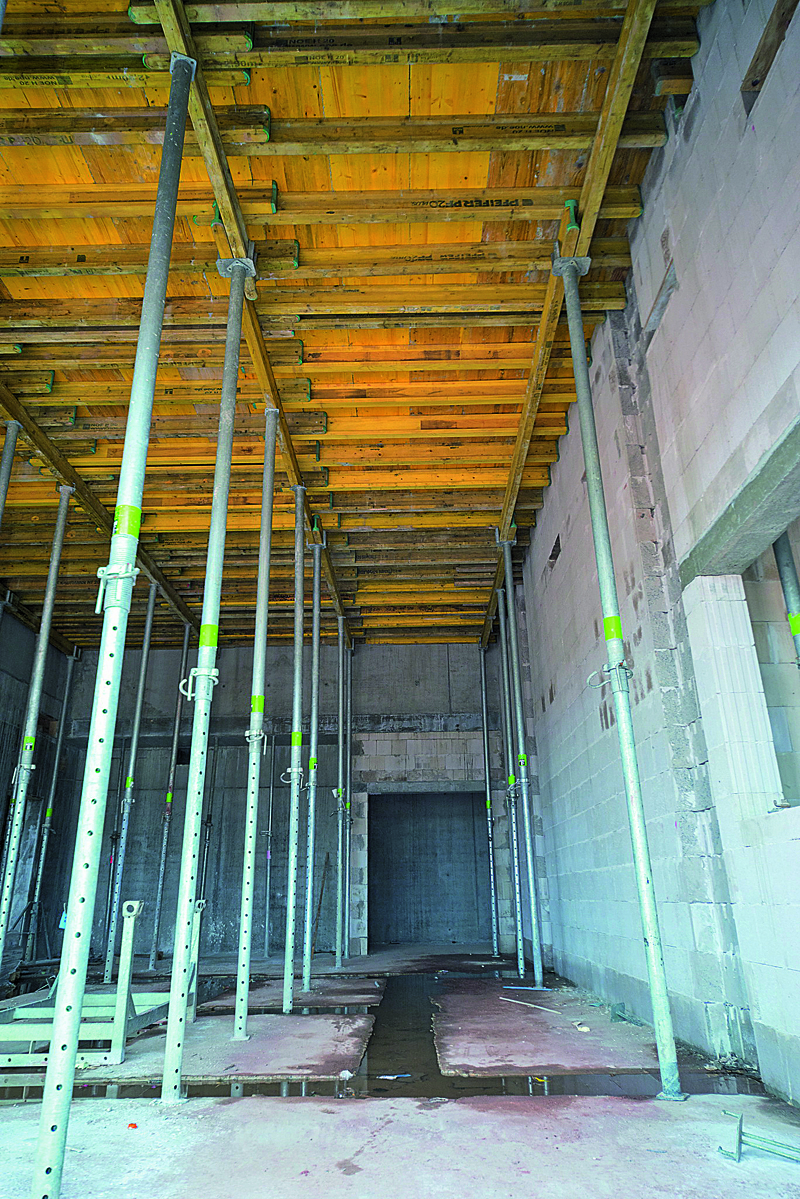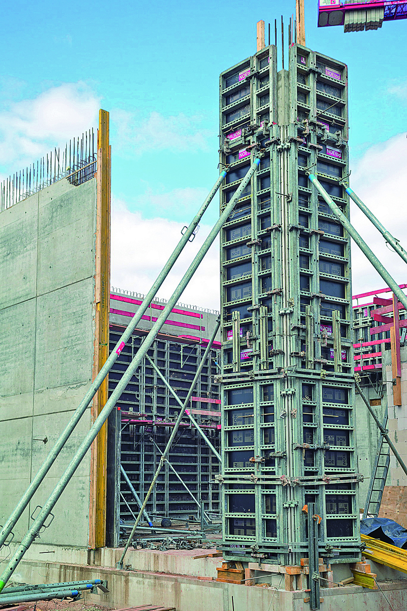 Flexibilität bot auch die NOE-20-Deckenschalung. Sie passt sich an Grundriss, Deckenstärke sowie Schalbelag an und erlaubt dabei die einfache Integration von Unterzügen. Möglich ist dies durch die abgestimmten Systemkomponenten, die im Wesentlichen aus H-20-Trägern bestehen, die längs bzw. quer montiert werden bzw. auf denen der Schalbelag befestigt wird, sowie Gabelkopfstützen. Diese sorgen dafür, dass die H-20-Träger in der gewünschten Höhe gehalten werden. Während der Bauzeit stellte NOE-Schaltechnik insgesamt 1 400 m² der NOE-H-20-Deckenschalung zur Verfügung. Nachdem die Decken erstellt worden waren, mussten sie aus bautechnischen Gründen noch einige Zeit unterstützt werden. Dies sicherten die Baustellenverantwortlichen mithilfe der LGW-200-Türme von NOE-Schaltechnik.