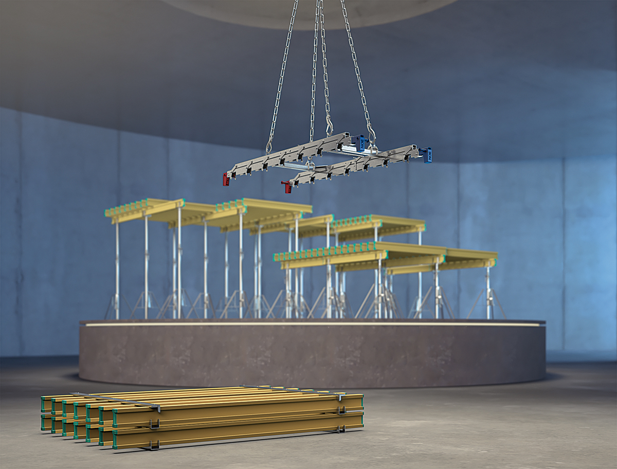 Dabei greift der NOE-H20-Lifter eine ganze Einheit von Belagsträgern und setzt sie auf den Jochträgern ab. Das »Loslassen« der Träger erfolgt automatisch durch Schwerkraft und erfordert keinen zusätzlichen Handgriff. Die Abstände der H20-Träger sind so gewählt, dass der Deckenbelag von oben verlegt werden kann, wodurch Zeit gespart wird.
