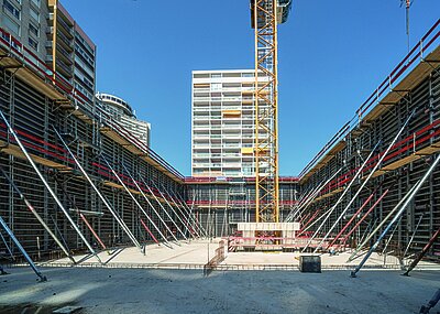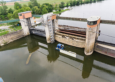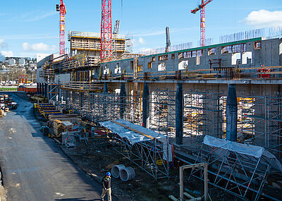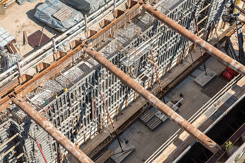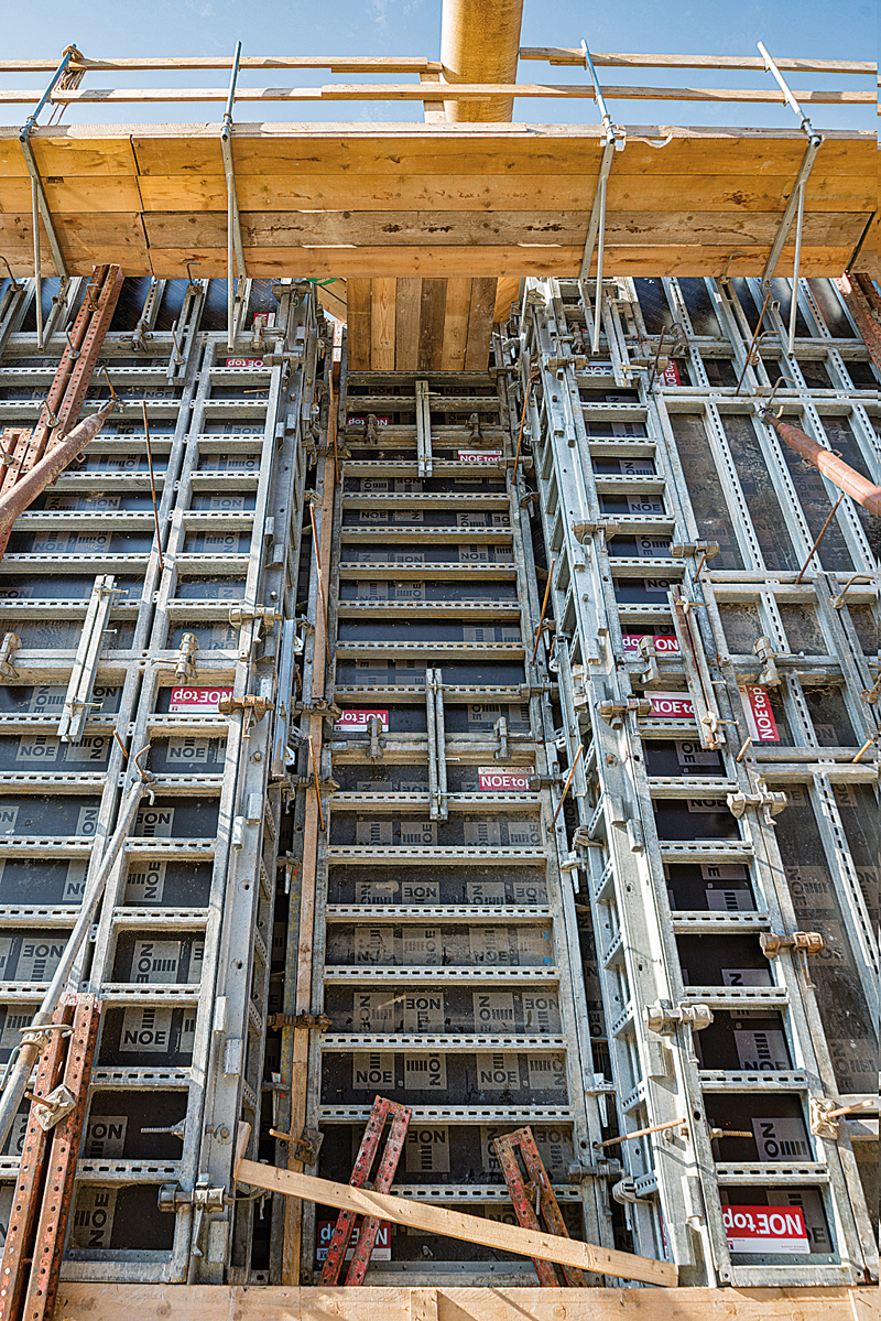 Auch die Arbeitssicherheit wird von den ARGE-Partnern Ludwig Freytag und Tiefbau Unterweser großgeschrieben. Die selbstsichernde Laufgerüstkonsole von NOE, die auf jedem Höhenniveau an jedem Querprofil der NOEtop-Schalung eingehängt werden kann, egal ob dieses horizontal oder vertikal verläuft, war eine Erleichterung. Durch die mit Durchstieg ausgestatteten Gerüstböden kann das Personal schnell und sicher zwischen den Gerüstebenen wechseln. Bis zur Fertigstellung der Schleuse im April 2022 haben die Mitarbeiter der ARGE noch einiges zu tun. So müssen die Betriebsgebäude erstellt, die Schleusentore eingebaut und eine Brücke über die Schleuse errichtet werden. t