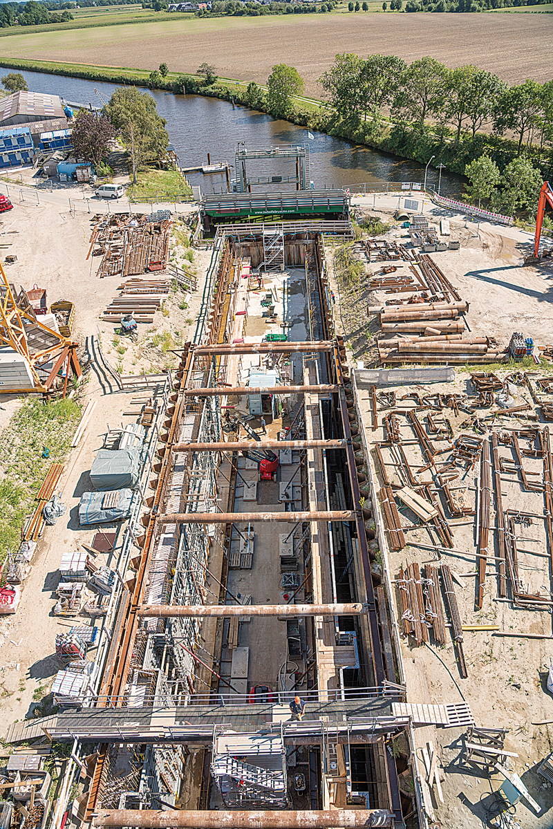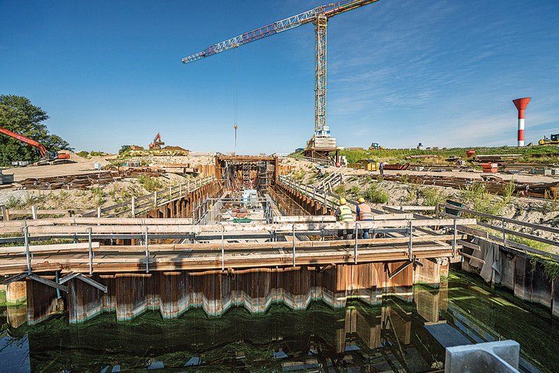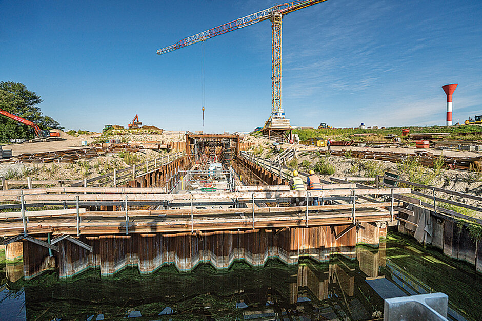 Zuerst wurden die wesentlichen Teile des Außenbereichs, des späteren Einlaufbereichs der neuen Schleuse und der bauzeitliche Küstenschutz errichtet. Zudem eine Entwässerungsanlage, die schon während des Baus den Abfluss des Hadelner Kanals sichert. Anschließend ging es an die Herstellung der Schleusenkammer. Die Baugrube wurde mit einem Spundwandkasten umfangen und während des Aushubs mit Aussteifungen gesichert. Um die Last des Objekts und des Wassers gleichmäßig ins Erdreich abzutragen, wurden 163 Stahlgründungspfähle mit einer Länge von rund 28,5 m in den Boden gebohrt und anschließend mit Zementmörtel verpresst. Zur Abdichtung der Baugrube mit einer Unterwasserbetonsohle, auf der Sohle und Wände der Schleusenkammer errichtet werden, vertrauten die Ludwig-Mitarbeiter auf Produkte und Planung von NOE-Schaltechnik. Bereits beim Bau des Jade-Wapeler Siels arbeiteten das Bauunternehmen und NOE vertrauensvoll zusammen.