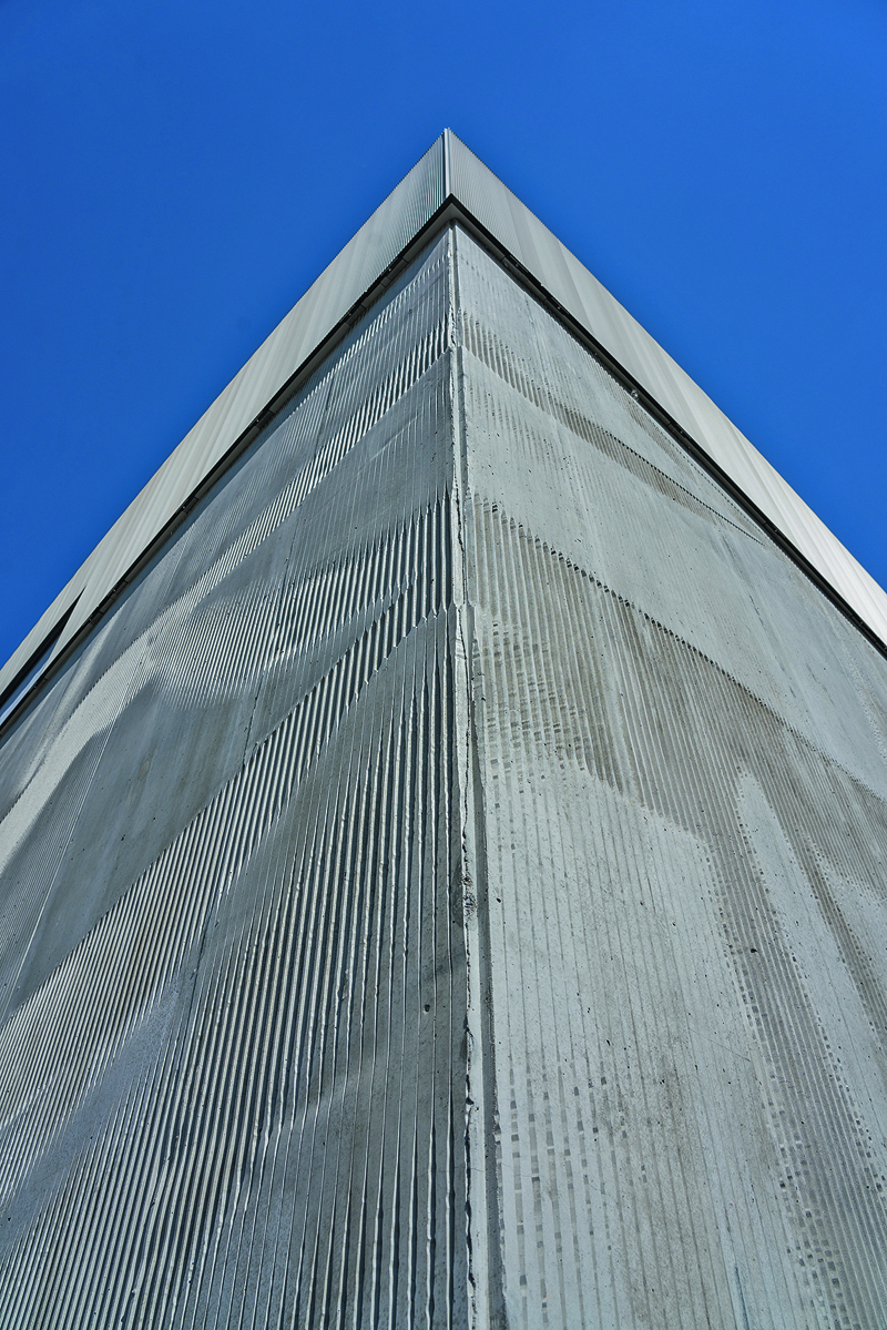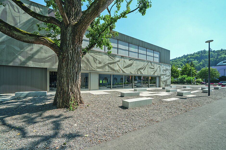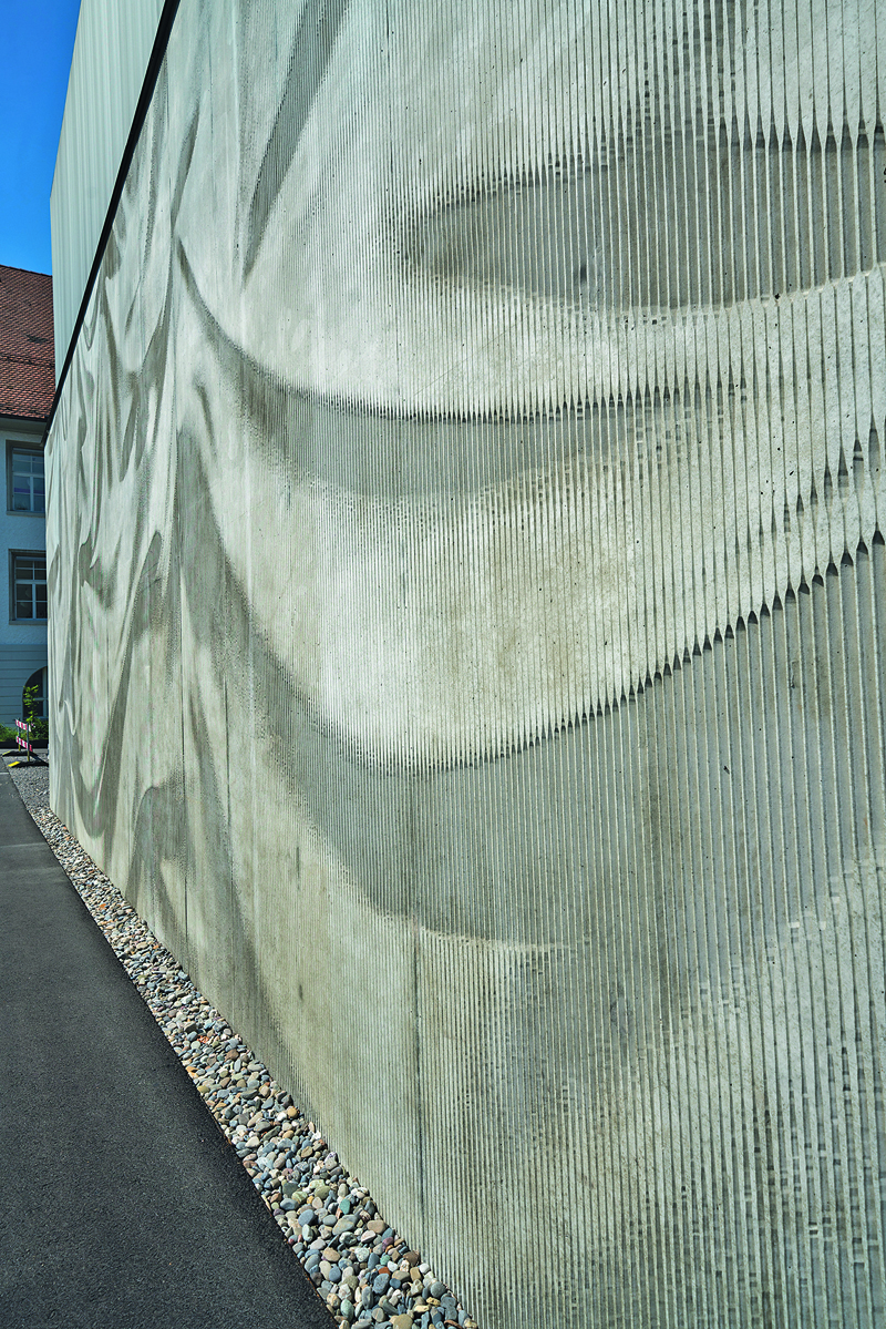 Die Aula ist von der Kubatur her betrachtet eher schnörkellos rechteckig, doch dank ihrer Sichtbetonfassade ein Blickfang. Denn sie gibt auf geschickte Art und Weise die Faltenbildung eines Stoffes wieder, der je nach Sonnenstand immer etwas anders erscheint. Möglich war das durch die sogenannte Fotogravurtechnik und die Strukturmatrizen von NOE-Schaltechnik. Bei der Fotogravurtechnik werden Bildinformationen digital in Linien unterschiedlicher Breite und Tiefe umgewandelt. So erzeugt der reflektierende Lichteinfall den Eindruck eines Bildes. Die NOE-Matrizen bestehen aus Polyurethan mit Glasfasergewebe, die mit der Schalung fixiert werden. Danach kann der Ortbeton wie gewohnt eingebracht werden. Sobald dieser ausgehärtet ist, lässt sich die Matrize entfernen und das Relief wird sichtbar. So können detailgetreu, je nach Lichteinfallswinkel, individuelle Strukturen und Bilder auf der Betonoberfläche wiedergegeben werden.