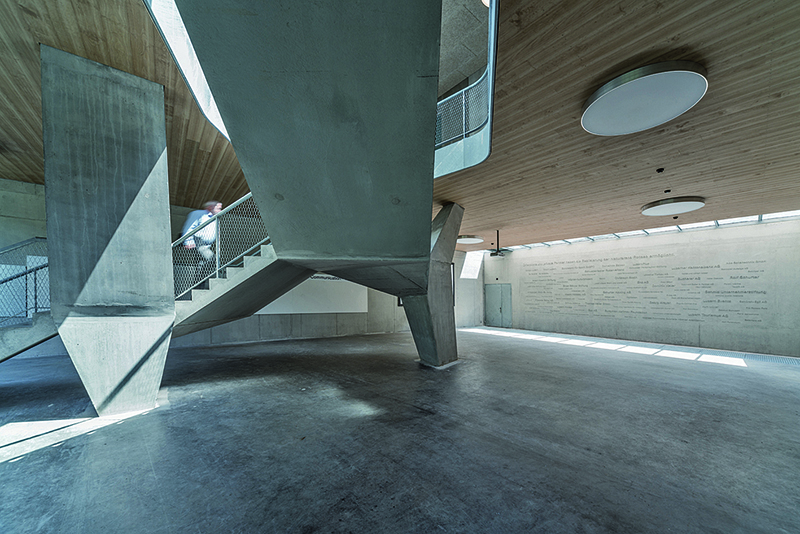 Umgerechnet rund 9,5 Mio. Euro hat der Bau des Gebäudes gekostet. Ein Teil davon stammt aus Spenden von Unternehmen, Verbänden oder auch Stiftungen. Ihre Namen wurden auf einer 8,55 m langen und 2,8 m hohen Sponsorenwand aus Beton verewigt. Technisch ermöglicht wurde dies durch die Schalungsmatrizen der NOE-Schaltechnik. Mit ihrer Hilfe lassen sich Sichtbetonwände beliebig strukturieren. Sie können zum Beispiel die Oberflächenbeschaffenheit einer Natursteinwand oder von geschnittenem Holz haben oder eben Schriftzüge aufweisen. Hierfür müssen die Matrizen, die unter dem Namen NOE-Plast angeboten werden, in der Schalung fixiert werden. Im Fertigteilwerk genügt es, sie in die Schalung zu legen. Bei Ortbetonbaustellen müssen sie auf die Schalung oder eine Trägerplatte geklebt werden. Klebt man die Matrize auf eine Trägerplatte, wird diese anschließend mit der Schalung verschraubt. Dies hat den Vorteil, dass die Schalung später wiederverwendet werden kann. NOE-Schaltechnik bietet über 100 Standardmotive an und dar über hinaus die Möglichkeit, eigene Wünsche umzusetzen.