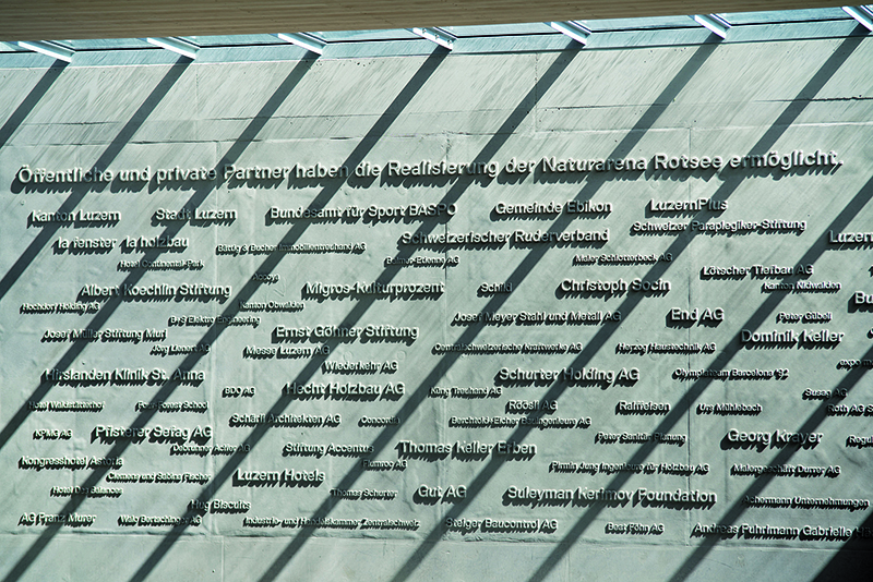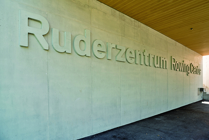 Von Weitem ist der Schriftzug »Ruderzentrum Rowing Center« an der Fassade zu sehen. Auch dieser ist mithilfe von NOE-Plast in den Beton gegossen. Während bei der Sponsorenwand viele kleine Buchstaben zu realisieren waren, mussten bei der Fassade nur wenige große Lettern hergestellt werden. Aus diesem Grund fertigte NOE einzelne Buchstaben und befestigten diese auf einer Trägerplatte. Mit deren Hilfe wurde dann die eigentliche Schalungsmatrize gegossen. Die Matrizen können, je nachdem wie pfleglich sie behandelt werden, bis zu 100-mal wiederverwendet werden. t