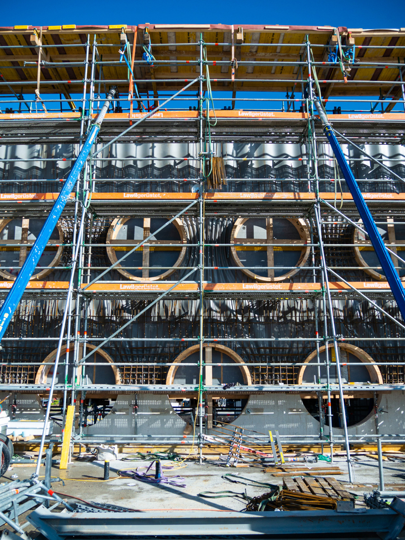 Sie übernimmt unter anderem die Errichtung der komplexen Sichtbetonfassaden. Diese stellen ein besonderes Highlight des Gebäudekomplexes dar. Während die Längsseiten als konkave Wellen ausgebildet sind, zeichnen sich Nord- und Südfassade durch eine Formgebung aus, die an einen Vorhang erinnert. Dieser umschließt gläserne Bullaugen mit einem Durchmesser von ca. 2,00 m und verleiht dem Objekt ein festliches Erscheinungsbild. Die Fassade der Arena wird in Ortbeton hergestellt und setzt sich nicht – wie man bei einer solch komplexen Gestaltung vielleicht annehmen könnte – aus einer tragenden Struktur mit vorgehängten Fertigteilelementen zusammen. Das hat zwar den Vorteil, dass bei perfekter Ausführung keinerlei Fugen sichtbar sind, fordert den Baustellenmitarbeitern jedoch größte Sorgfalt und viel Können ab – denn es gibt keine Chance für einen zweiten Versuch. Ihre Oberflächenstruktur erhalten die Betonfassaden durch die Schalungsmatrizen der Firma NOE-Schaltechnik.