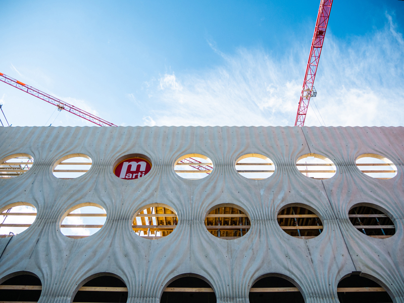 Vor dem Betonieren ist auf die Schalung resp. die Matrizen Trennmittel aufzutragen um das Ausschalen zu ermöglichen. Bereits im Vorfeld hat die ARGE Baumeister Trennmittel verschiedener Hersteller getestet. Dabei wurde festgestellt, dass sich mit NOE-Schalwachs die besten Ergebnisse erzielen lassen und hat sich für dieses Produkt entschieden. „Beim Ausschalen ist es wichtig, den richtigen Zeitpunkt zu treffen“, sagt Marcel Lappert, Projektleiter der ARGE ZSC Arena „Anfangs hatten wir damit etwas Schwierigkeiten. Denn ist der Beton bereits weitgehend ausgehärtet, entsteht ein Unterdruck. Dem begegnen wir, indem wir die Schalung bereits nach einem Tag lockern. Um den Beton von der Matrize zu trennen, nutzen wir spezielle Kissen, die dazwischen befestigt und langsam mit Luft gefüllt werden.“ Ein großer Vorteil der NOEplast-Strukturmatrizen ist, dass sie sich bis zu 100-mal einsetzen lassen. Dies wird auch beim ZSC-Lions-Projekt genutzt. Aufgrund der spezifischen Fassadengeometrie werden einige Matrizen voraussichtlich bis zu 30-mal eingesetzt werden.