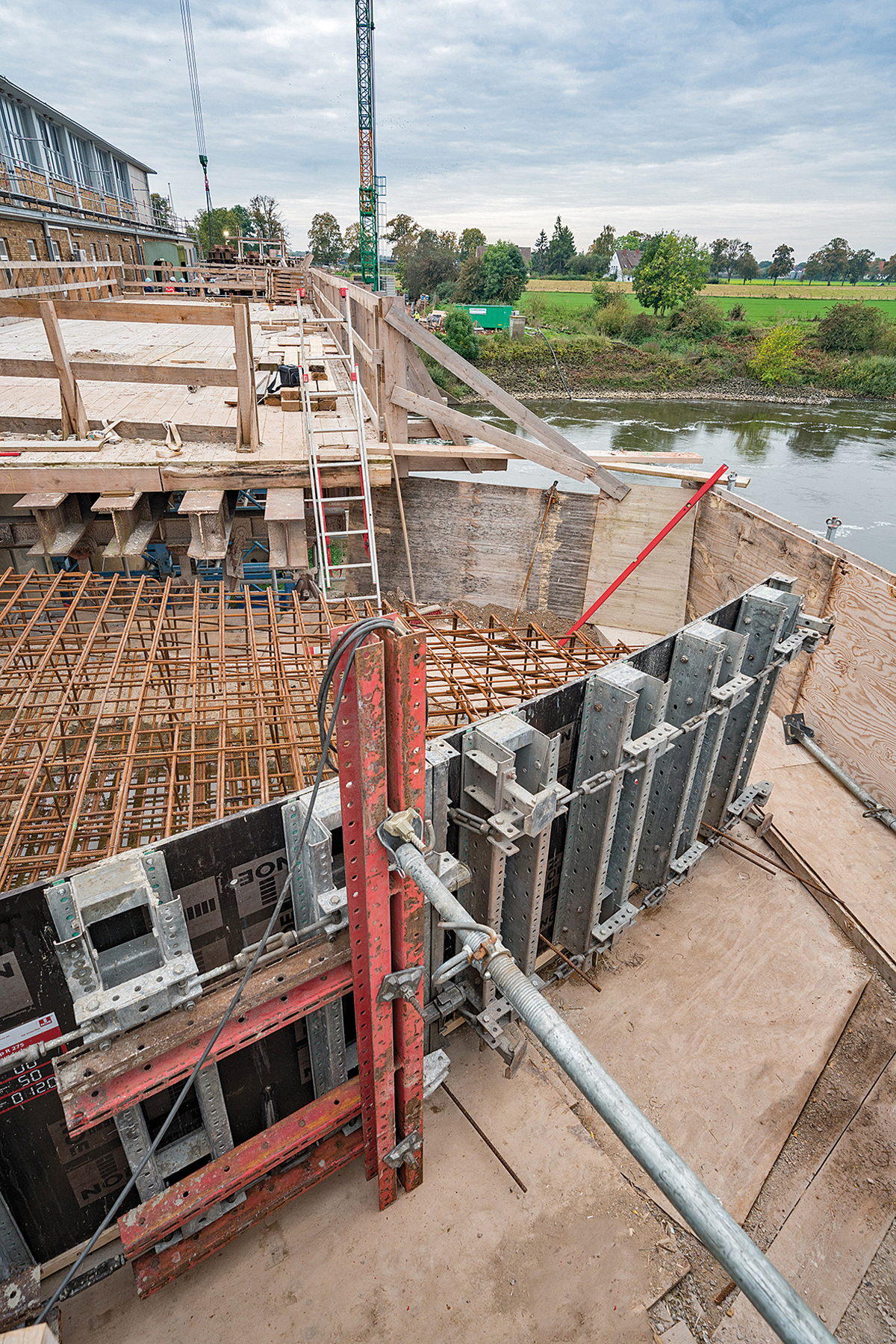 Ähnlich anspruchsvoll war der Bau von Strompfeiler 6, denn auch für ihn war eine Sonderschalung erforderlich. Da Spezialanfertigungen immer Zusatzkosten bedeuten, strebte man an, die Sonderkonstruktion gleich mehrfach zu verwenden und dabei den Bauablauf nicht zu stören. Infolgedessen entschied sich das Bauunternehmen Ludwig Freytag auch hier für eine Kombination aus NOEtop XXL und Sonderanfertigung. Doch im Gegensatz zu Pfeiler 5 wurde hier der gesamte Pfeilerquerschnitt auf einmal geschalt und betoniert – aber nicht in voller Höhe. Zunächst errichteten die Baustellenmitarbeiter den unteren Teil des Pfeilers, warteten, bis dieser ausgehärtet war, und hoben dann die Kombination aus Standard- und Spezialschalung an, um auch den oberen Teil zu betonieren. So war es auch hier möglich, mithilfe einer »halben Schalung« den kompletten Baukörper zu errichten und dabei Geld zu sparen. Eine weitere Herausforderung war der Brückenüberbau mit 5 m breiter Fahrbahnplatte. Genutzt wurde eine vorgespannte Brücke mit π-förmigem Querschnitt, der mit NOE Alu L hergestellt wurde.t