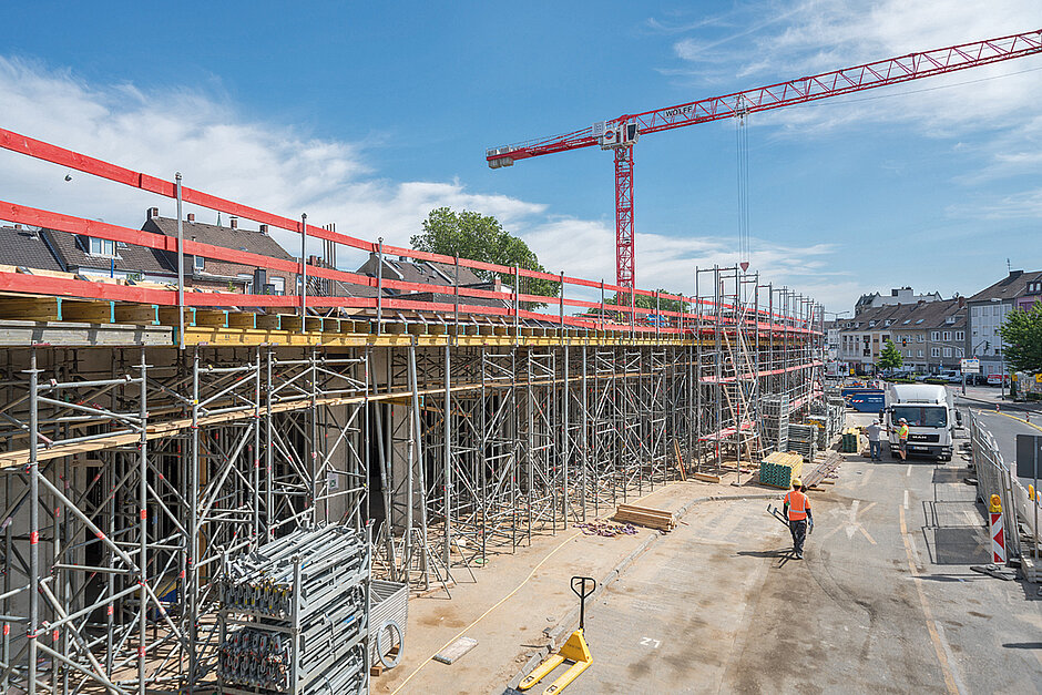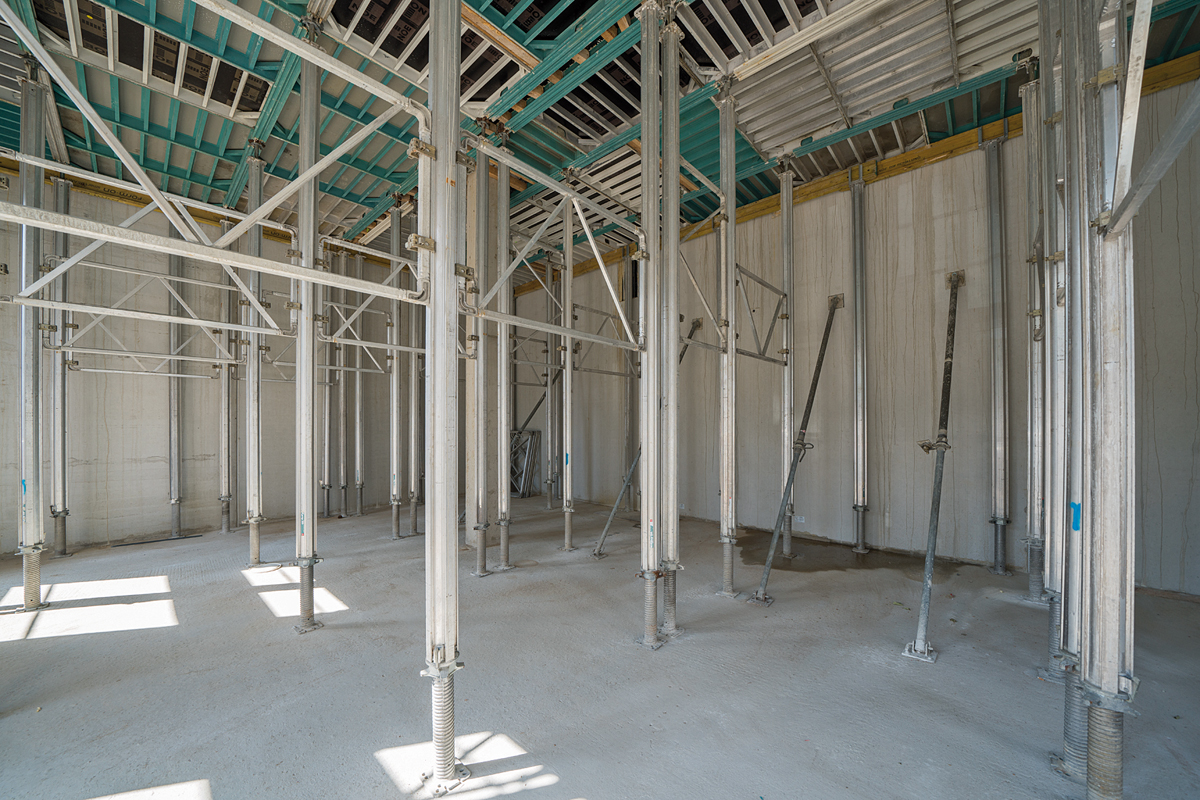 Anschließend ging es an das Erstellen der nächsten Geschossdecke, bei dem wiederum die NOEdeck zum Einsatz kam. Da hier jedoch eine Höhe von etwa 5 m überbrückt werden musste, war ein entsprechender Unterbau erforderlich. Dieser wurde im NOEprop-Traggerüstsystem gefunden. Dessen turmähnliches Traggerüst setzt sich aus Aluminium-Stützen und Stützrahmen zusammen, die dem System maximale Flexibilität verleihen. Je nachdem, wie die Bestandteile miteinander kombiniert werden, lässt sich eine Höhe von bis zu 15 m überwinden – dementsprechend ideal war es für die Baustelle in Mönchengladbach. Die Elemente des NOEprop bestehen aus Aluminium – sind also vergleichsweise leicht, und doch haben manche Stützen eine Tragkraft von bis zu 160 kN.