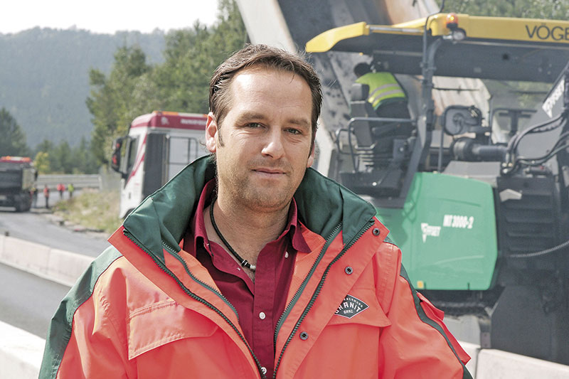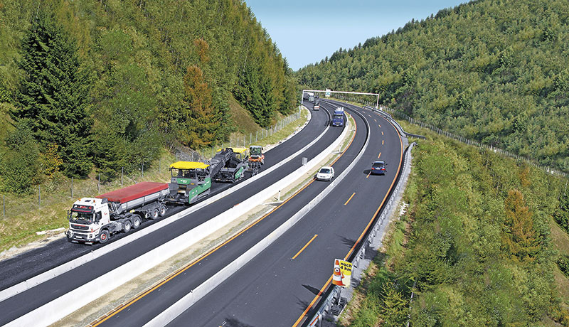 Um auch unter den örtlichen Bedingungen eine ununterbrochene Versorgung mit Mischgut sicherzustellen, waren eine perfekte Baustellenlogistik und optimales Materialmanagement gefragt. Die Vorgaben bezüglich der Ebenheit waren streng, weil die österreichischen Richtlinien und Vorschriften für den Straßenbau lediglich geringe Abweichungen erlauben. Als Lösung bot sich die Mischgutversorgung non-stop mit einem Beschicker an. Die beauftragte »Arge A 2 Zöbern–Pinggau«, bestehend aus der Bauunternehmung Granit und der Swietelsky Baugesellschaft, setzte auf den Power-Feeder MT 3000-2 Offset von Vögele mit schwenkbarem Transportband.