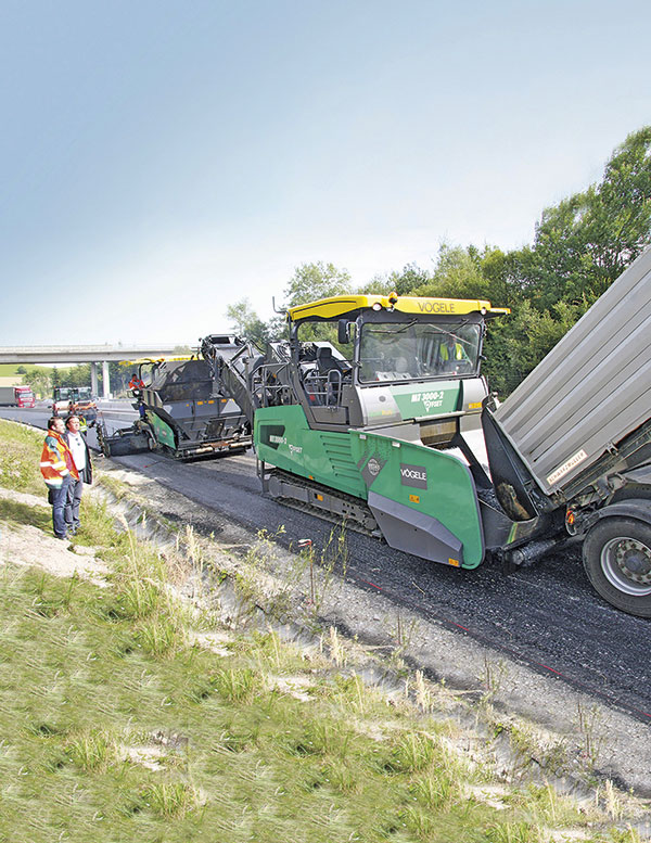 Im Gespann mit dem Fertiger Super 1900-2 bewies der Vögele Power-Feeder, welch hohe Bedeutung er für die Einbauqualität hat. Er übernahm das Mischgut von den Lkw und übergab es kontinuierlich und berührungslos an den Fertiger, während die Lkw auf der Baustelle navigierten. Dank seiner großen Kapazität – inklusive Zusatzbehälter des Fertigers kann er die gesamte Ladung eines 25-t-Lkw übernehmen – hielt der Beschicker immer ausreichend Mischgut vor, um einen unterbrechungsfreien Materialfluss für den Fertiger zu gewährleisten und damit Anfahrbuckel nach Einbaustopps wirksam zu verhindern.