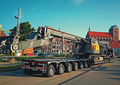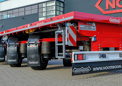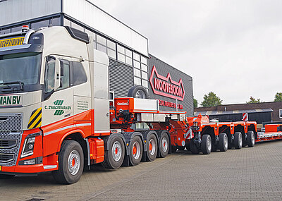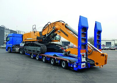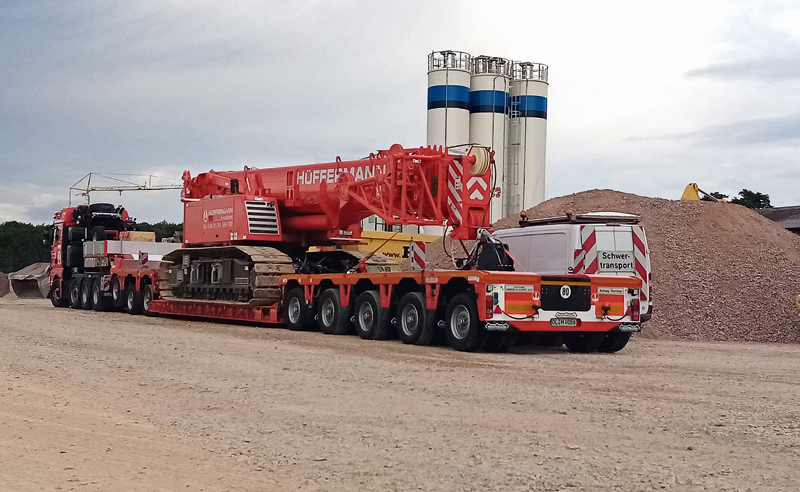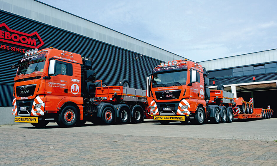 Hüffermann Krandienst hat seinen Fuhrpark für Spezial- und Schwerlasttransporte erweitert. Die jüngste Investition betrifft vier neue Nooteboom-Euro-PX-Tiefbetten mit Pendelachstechnologie – zwei EURO-47-02(P)-2-Achs-Tiefbett und zwei EURO-119-35(ICP)-5-Achs-Tiefbett mit 3-achsigem Interdolly. Die Tiefbetten verfügen über Nooteboom-Pendelachs-Technologie mit 600 mm Hub und bis zu 70° Lenkeinschlag sowie Baggerstielmulde. Die 2-Achs-Tiefbetten besitzen u. a. einen abnehmbaren Außenträger-Schwanenhals. Die 3+5-Achs-Tiefbetten sind wie auch die 2-Achs-Tiefbetten mit einem auf mehr als 12 m teleskopierbaren Ladebett ausgerüstet. Alle Fahrzeuge besitzen eine große Zahl an Zurrösen zur Ladungssicherung. t
