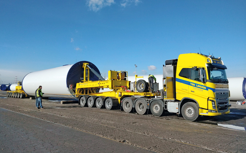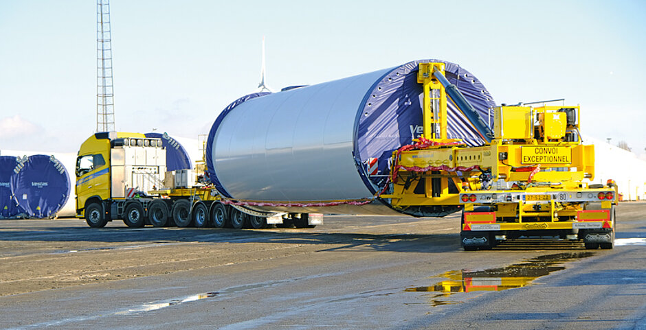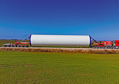 Mit dem neuen MWT-XL können auch Turmteile mit deutlich größerem Durchmesser transportiert werden. Der MWT-XL ist flexibel einsetzbar, da das Fahrzeug für unterschiedliche Durchmesser bis zu den größten Turmteilen mit einem Durchmesser von ca. 6 300 mm geeignet ist. Die größeren Durchmesser der Turmabschnitte stellen andere Anforderungen an die gewählte Transportlösung. So liegt beispielsweise der Schwerpunkt der Ladung während des Transports viel höher. Um die bis zu 100 t schweren Turmteile sicher auf der Straße zu transportieren, ist eine höhere Stabilität erforderlich – selbst bei hohen Geschwindigkeiten von bis zu 80 km/h.