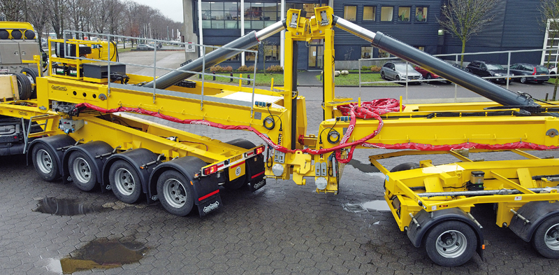 Das Design und die Konstruktion der einstellbaren Liftadapter nennt der Hersteller als Grund für das geringe Eigengewicht von ca. 7 t. Die Klemmverbindungen der Liftadapter sind hydraulisch stufenlos auf den Durchmesser des Turmelementes bis zu 6 300 mm einstellbar. Weil die Liftadapter mit der Fernbedienung in alle Richtungen bewegt werden können, sollte das An- und Abkuppeln des Turmelements einfach vonstattengehen. Das Gleiche gilt laut Hersteller für die Kurzkupplung des Nachläufers mit dem Jeep-Dolly für die Rückfahrt.