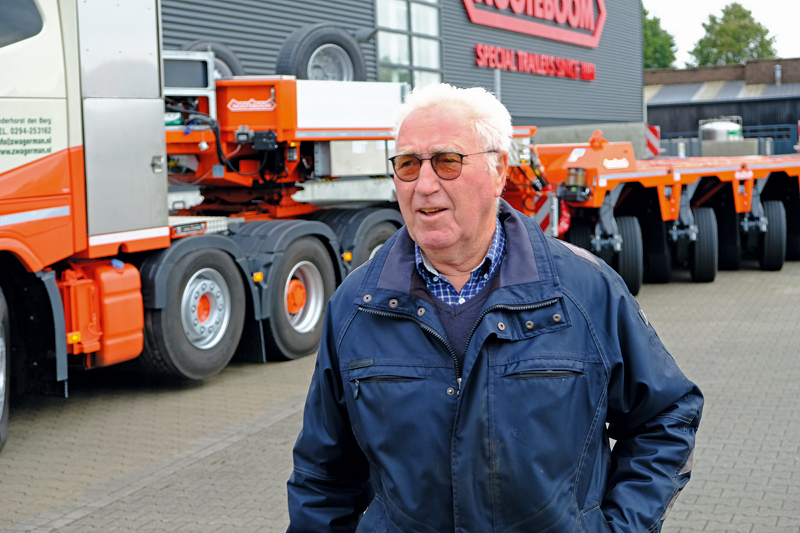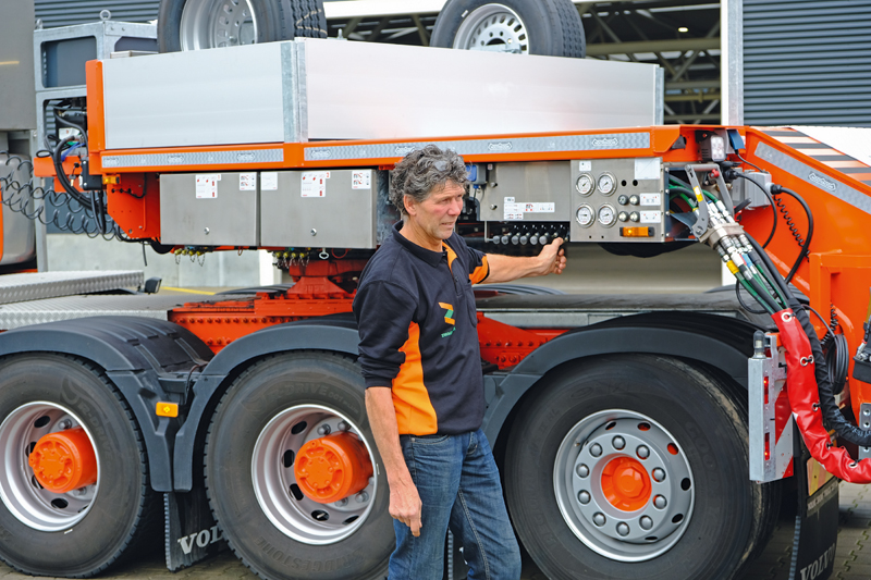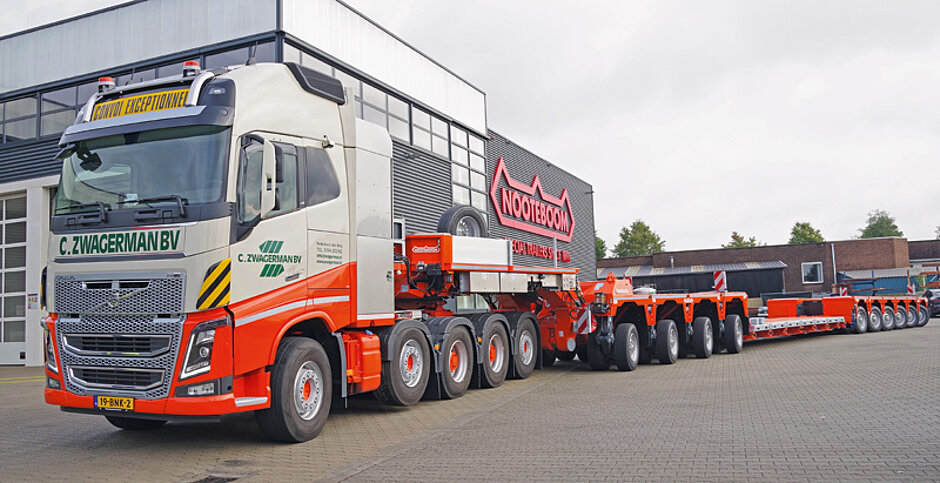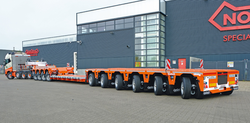 Die Krane und Maschinen, die Cor Zwagerman in seinem Unternehmen transportieren muss, werden immer schwerer. »Dieser neue Tieflader ist der größte Nooteboom, der je auf die Straße gebracht wurde«, so der Geschäftsführer und Eigentümer. Mit einer deutschen Ausnahmeregelung beträgt die Nutzlast etwas mehr als 100 t, Zwagerman betritt damit ein neues Marktsegment. »Der 4+6-Tieflader von Nooteboom hat für uns eine Reihe von Vorteilen. Um den Tieflader so weit wie möglich an die deutschen Sondergenehmigungen anzupassen, ist der Achsabstand von bisher üblichen 1,36 m auf 1,51 m gestiegen. In der Praxis werden die Genehmigungen aufgrund der geringen Belastung von Brücken und Viadukten durch den größeren Achsabstand von den verschiedenen deutschen Bundesländern leichter erteilt. Ein weiterer Vorteil ist die Kurzkupplung, mit der wir den Anhänger problemlos in einen 10-achsigen Semitieflader umrüsten können.« In dieser Konfiguration erhöht sich die Nutzlast auf rund 110 t und Zwagerman kann die Lenkung des Interdolly leicht an diese kürzere Konfiguration anpassen. Die Beziehung zwischen Nooteboom und Zwagerman besteht seit mehr als 50 Jahren. »Das gab uns genug Vertrauen, um diesen Auftrag an Nooteboom zu vergeben«, so der Inhaber.