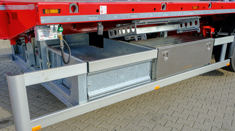 Nooteboom bietet diverse Aufbewahrungsmöglichkeiten für die sichere und einfache Lagerung von Unterlegkeilen und andern losen Teilen, darunter offene Staufächer und abschließbare Edelstahl-Werkzeugkisten. Diese sind unter der Ladefläche montiert. Je nach Aufliegertyp und gewünschter Ladeflächenlänge ist der Unterbau in verschiedenen Größen erhältlich. Innerhalb der gewählten Größe bestimmt der Kunde selbst die Ausgestaltung des offenen Staufachs, der Werkzeugkiste und/oder des Reserveradhalters.