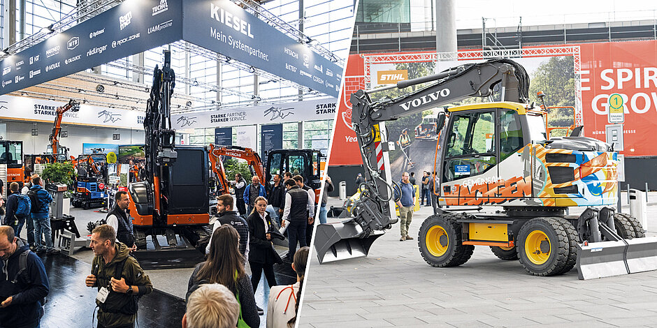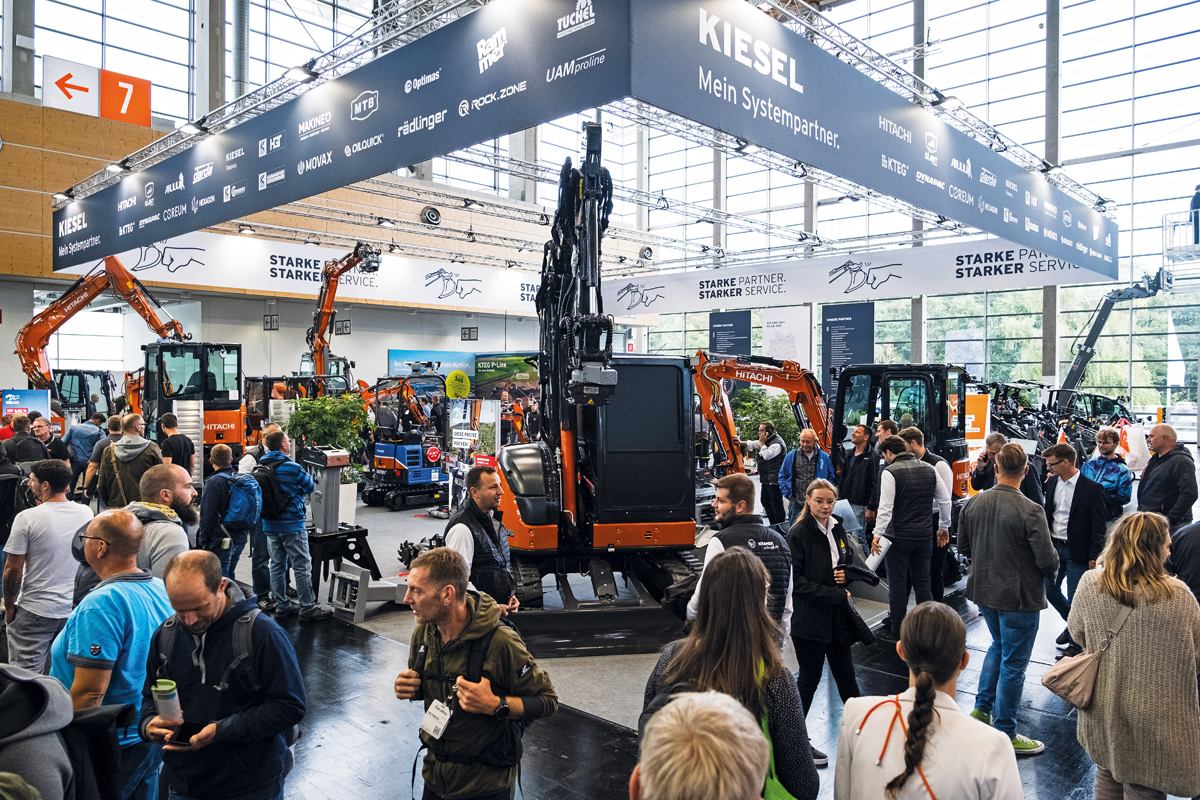 Bei Kiesel hat man den »Spieß« quasi umgedreht: Statt auf tonnenschwere Einzelakteure zu setzen, drehte sich alles um Systemlösungen. Vorgestellt wurden Mini- und Kompaktbagger sowie eine große Anzahl an Anbaugeräten – kombiniert mit digitalen Tools und Assistenzsystemen. Die Zielsetzung ist unter anderem, den Bagger zum multifunktionalen Geräteträger weiterzuentwickeln. Gegenüber dem bauMAGAZIN erklärte Maximilian Schmidt, Geschäftsführer Vertrieb bei Kiesel, dass das insbesondere durch ein klares Mit-, aber eben auch Weiterdenken gelingt. »In diesen durchaus angespannten Zeiten wollen wir den Kiesel-Unterschied machen – mit starken Partnern und starkem Service.« Tatsächlich hatte Kiesel weit über 50 Kompaktmaschinen-Partner aus Deutschland und Österreich vorgestellt, darunter zum Beispiel die Systeme der KTEG-P-Line, Giant-Radlader, Walzenzuglösungen von Dynapac sowie Transportlösungen von Unsinn Fahrzeugtechnik für Bagger und eine große Bandbreite unterschiedlichster Anbaugeräte. Am Stand von Kiesel stach allerdings ein Exponat besonders hervor, der KTEG 63US-6, und damit ein Prototyp-Kompaktbagger aus der 6-t-Klasse. Konzipiert wurde er für das Arbeiten auf engen Baustellen, kombiniert mit erstaunlicher Hubkraft.