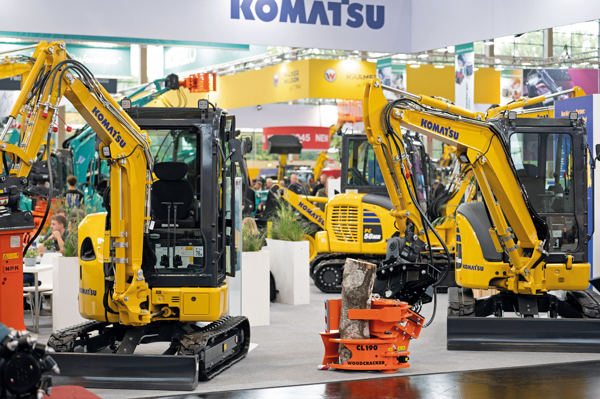 Im Rahmen der Messe machte der japanische Hersteller allerdings auch auf die Notwendigkeit aufmerksam, für einen einfachen Transport im Garten- und Landschaftsbau zu sorgen. Hier stehen kompakte Minibagger im Fokus wie etwa der PC17R-5, der PC20R-5 oder der PC24MR-5, die aufgrund von Gewicht und Abmessung samt Anbauwerkzeug auf einen 3,5-t-Anhänger passen. Noch flexibler, so Komatsu, seien die eigenen Kompaktmaschinen durch den Einsatz optionaler Zusatzausstattungen – etwa mit Laufwerks- und Schildverbreiterung. Im Bereich der kompakten Mobilbagger stellte Komatsu im Übrigen den PW138MR-11 vor: Mit einem Betriebsgewicht von 13 t bis 14,3 t, den kompakten Abmessungen und einer Motorleistung von 72,6 kW dürfte er sowohl für Schwerlast-Hubeinsätze als auch für typische Erdbauarbeiten auf engen Baustellen geeignet sein – etwa im Straßenbau oder bei Kanalarbeiten. Die maximale Grabtiefe liegt bei rund 4,3 m. Bei Radlader-Fans im Kompaktbereich hatte wiederum der WA80M-8 seinen großen Auftritt: Mit seiner großen und übersichtlichen Kabine, erweitert durch die Möglichkeit des Parallelhubs beim Einsatz mit Gabelzinken aufgrund der Easy Fork-Kinematik, bietet er laut Hersteller einen hohen Fahrerkomfort und eine erstaunlich gute Rundumsicht. Er ist für vielseitige Einsatzmöglichkeiten mit einem AP Frontgrader vom Typ Twister III ausgestattet. Abgerundet wurde das gezeigte Portfolio durch den neuen Kompaktlader SK715-8: Durch die optionale Super-Flow-Hydraulikanlage, die groß ausgelegte Kabine und die 34,3 kW an Leistung soll der 2,8 t schwere Kompaktlader für Vielseitigkeit stehen.