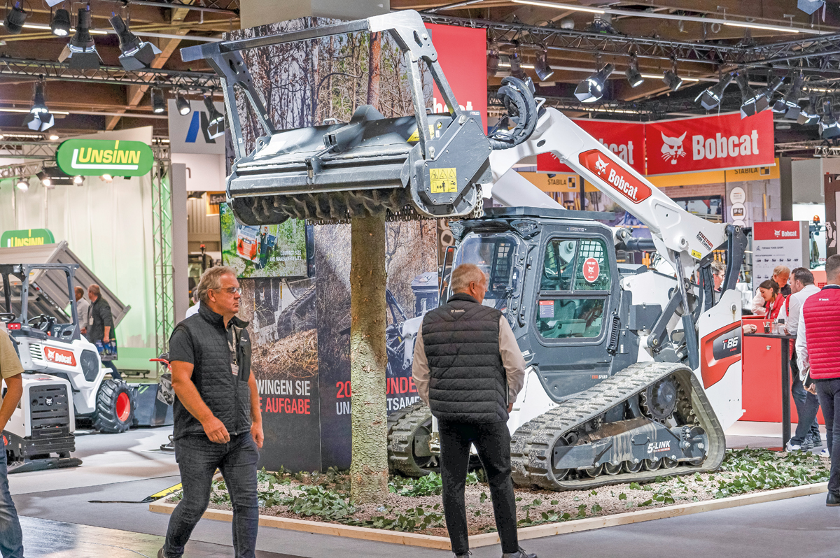In der Welt der Kompaktmaschinen hat Doosan Bobcat schlichtweg Heimvorteil: Der US-amerikanische Hersteller brachte eine eindrucksvolle Wagenladung an Exponaten auf die GaLaBau – und wusste diese, offen gesprochen, ebenso eindrucksvoll in Szene zu setzen. Sowohl auf dem Messestand in der Halle als auch im Außengelände im Rahmen umfangreicher Live-Demonstrationen setzte Bobcat auf Vielfalt. Zugegeben, angesichts der großen Bandbreite an Maschinen, die der Hersteller aktuell im Portfolio hat, dürfte das nicht sonderlich schwergefallen sein. Lob heimste sich Bobcat allerdings auch dafür ein, bewusst mit den Anwendern ins Gespräch zu kommen. Das Unternehmen hat die Nürnberger Messe genutzt, um mit Interessierten nicht nur über Leistungsdaten und Stückpreise zu sprechen. Wichtige Themen waren unter anderem der Bedienkomfort, die Kompatibilität mit Anbaugeräten sowie die Nutzung elektrisch betriebener Modelle. Gezeigt hat Bobcat unter anderem die Minibagger E19, E60, E10e sowie E27 und E27z: Letzterer wurde laut Hersteller entwickelt, um die auffallend geräumige Kabine, die in dieser Größenklasse als Besonderheit gilt, mit hoher Bewegungsflexibilität zu verbinden. Der E27z ist eine Maschine ohne Hecküberhang und lässt sich sogar mit optional schwerem Gegengewicht nahe an einer Mauer bedienen. Gleichwohl erweist sich das Modell mit 2,7 t als Leichtgewicht, stellt man dieses mit den 15,4 kW Leistung, den extrem kompakten Abmessungen und einer Ausbrechkraft (beim Graben) von 16,2 kN ins Verhältnis. Gekennzeichnet war der Messeauftritt von Bobcat außerdem von Kompaktladern wie dem S450 mit 1,3 t Kipplast und 36,5 kW Leistung, Raupenladern wie dem T86, dem MT100 und dem T450 sowie dem Teleskopen TL25.60.