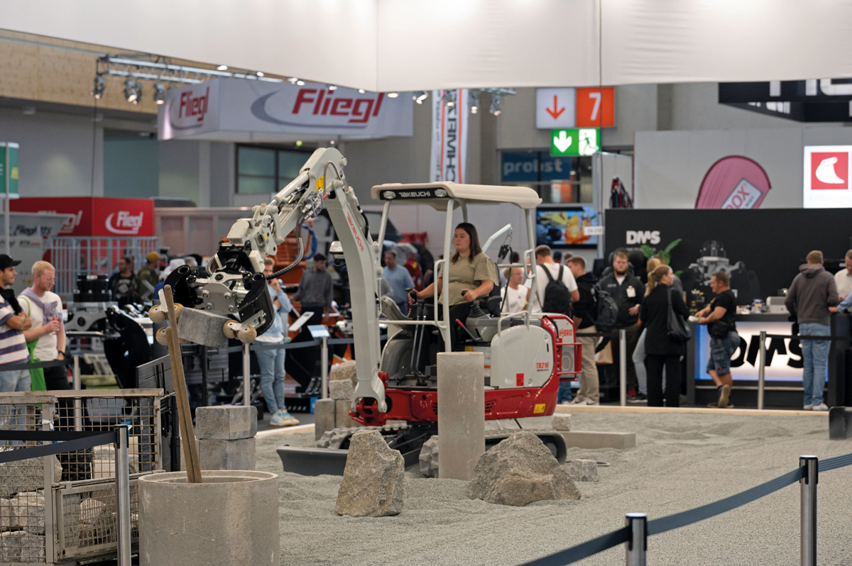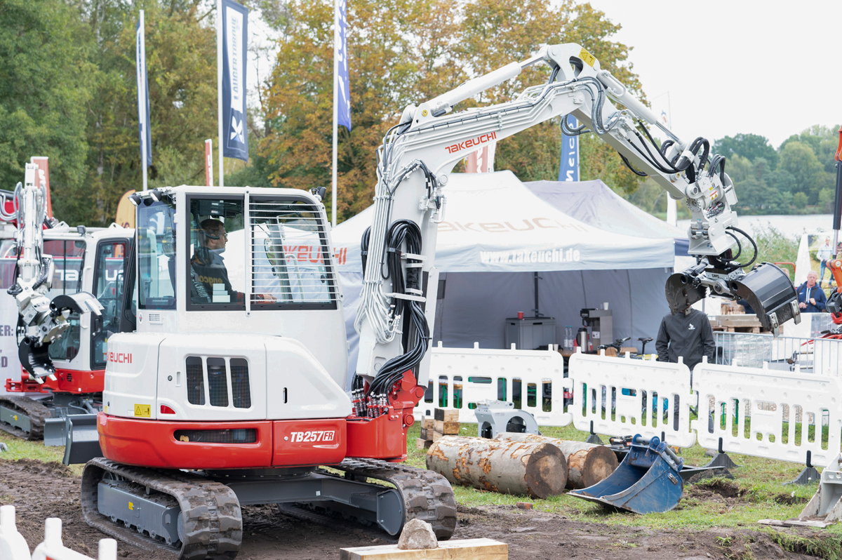 Nicht zu übersehen war allerdings auch das Maschinen-Repertoire von Takeuchi. Der japanische Hersteller, der als Vordenker der Minibagger- und Laderaupen-Sparten gilt, ist aufgrund seiner Kompetenzen im Kompaktbereich auf der GaLaBau nicht mehr wegzudenken – selbiges dürfte allerdings auch für Wilhelm Schäfer gelten. Tatsächlich ist das Unternehmen bereits seit 1985 exklusiver Vertriebspartner der Marke Takeuchi in Deutschland und hat die GaLaBau in Nürnberg genutzt, um beispielsweise den Minibagger TB 225 vorzustellen: Die Maschine wiegt gerade einmal 2,4 t und leistet dabei laut Hersteller »mehr als mancher 3-Tonner«. Eine Besonderheit: Der TB 225 passt auf einen gewöhnlichen Pkw-Anhänger mit Zulassung bis 3,5 t, um ihn zum Einsatzort zu bringen. Ein teleskopierbares Laufwerk soll zudem hohe Stabilität bieten, während bis zu vier serienmäßige Zusatzkreisläufe den Minibagger flexibler auf der Baustelle machen. Das Modell verfügt über ein verstellbares Laufwerk von 1 100 mm auf 1 500 mm. Insgesamt hat Takeuchi 17 Bagger- und Ladermodelle nach Nürnberg gebracht, darunter die neue Laderaupe TL 10V2, die rund 4,6 t auf die Waage bringt und für Einsätze konzipiert wurde, die große hydraulische Kraft voraussetzen.