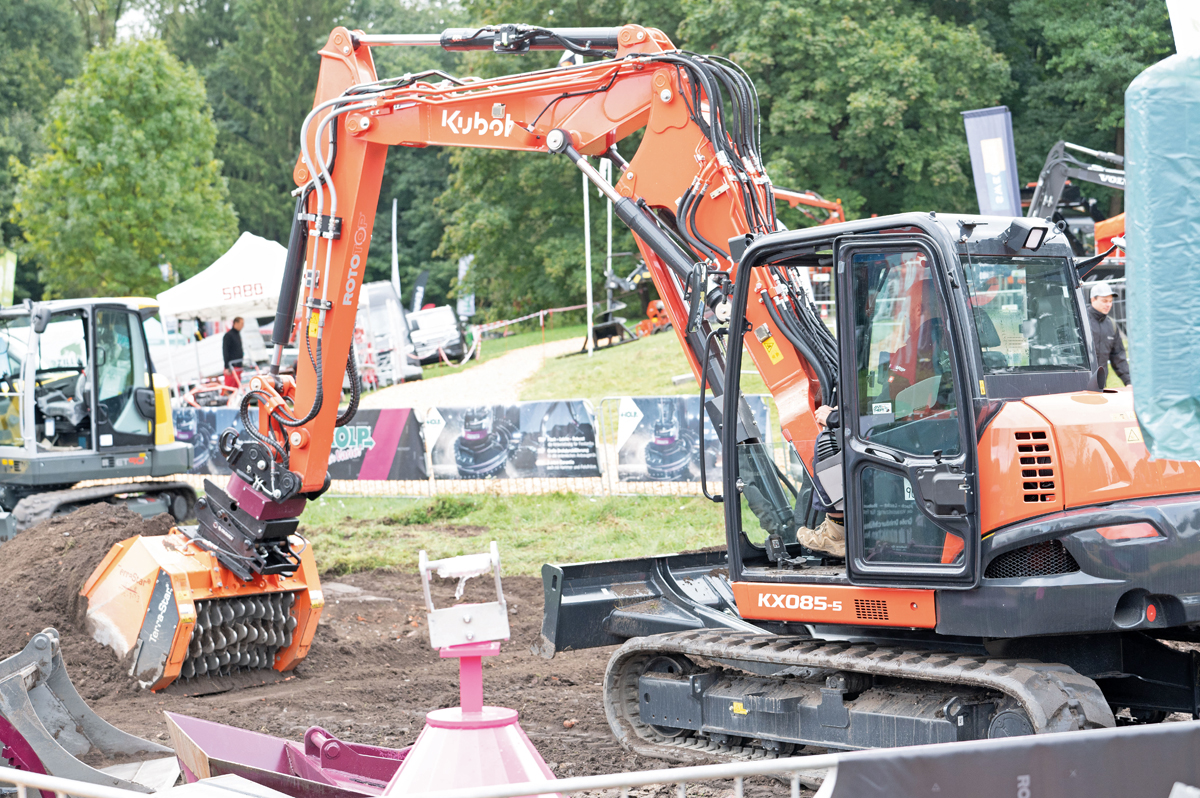 Im Außengelände hat Holp eindrucksvoll aufgezeigt, wie leistungsstark die eigenen Drehantriebe und Anbaugeräte sind – hier am ebenfalls vielbeachteten Kubota-Kompaktbagger KX085, der die notwendige Power mitbringt, um die Geräte so effizient wie möglich einsetzen zu können.